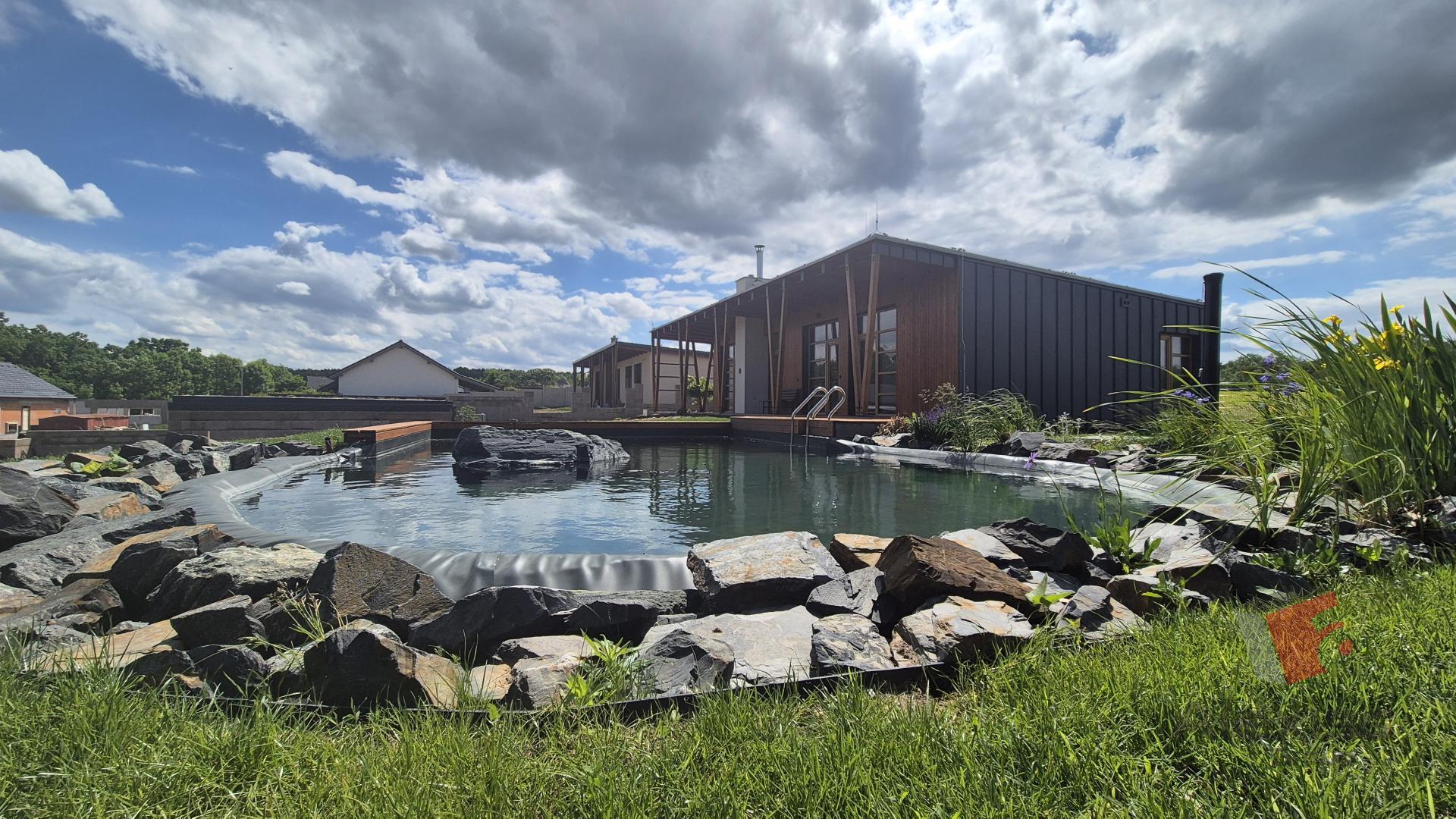 Koupací jezírko se solární sprchou a technickým zázemím