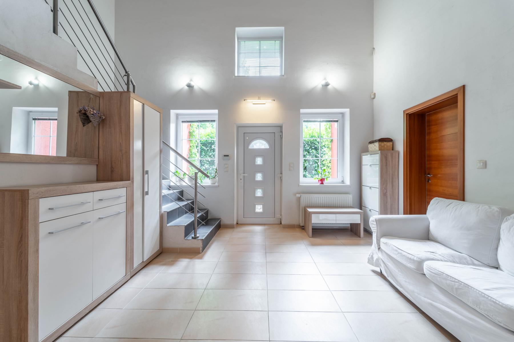 Do domu vstoupíte přes otevřenou halu s vysokým otevřeným stropem až do horního patra.