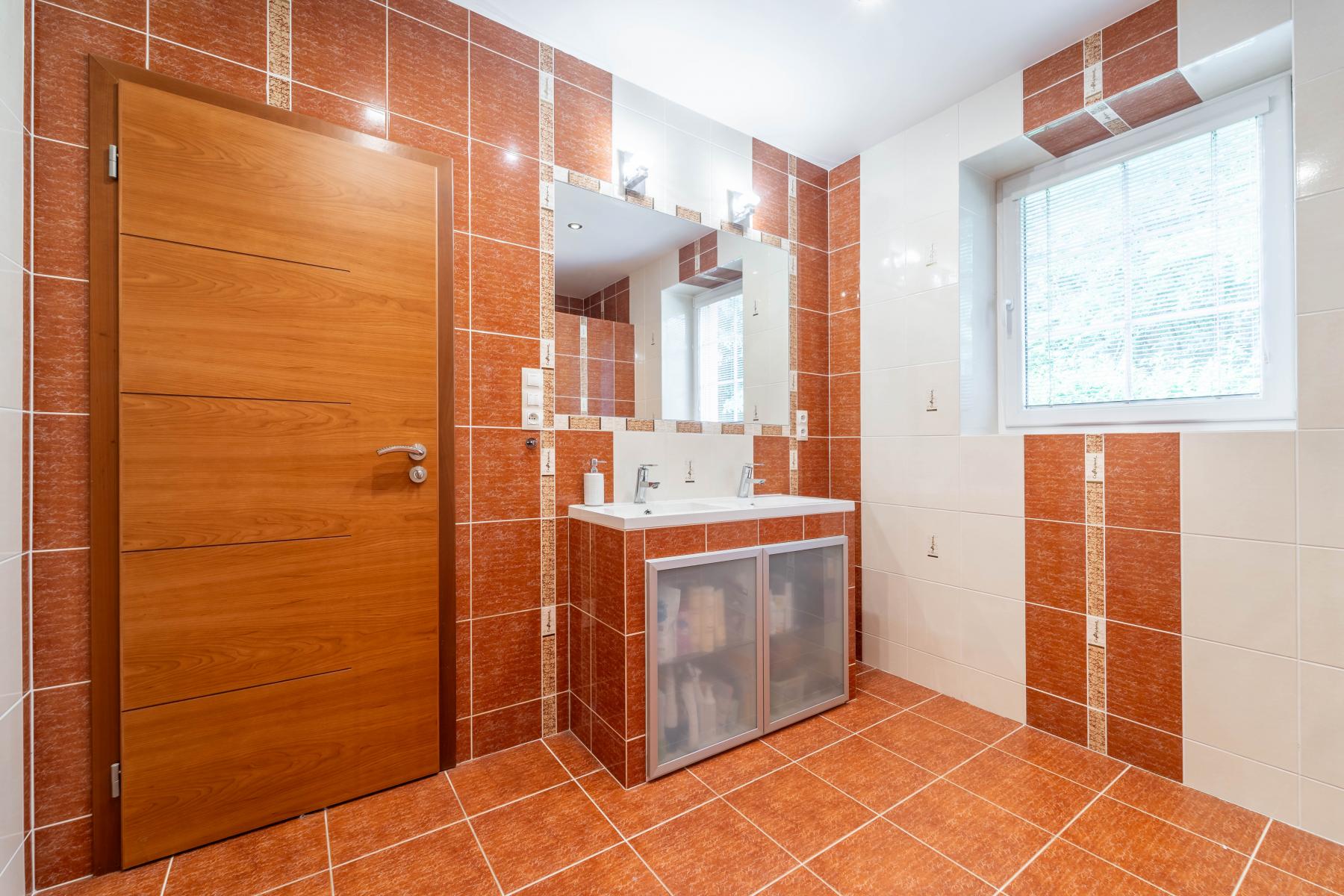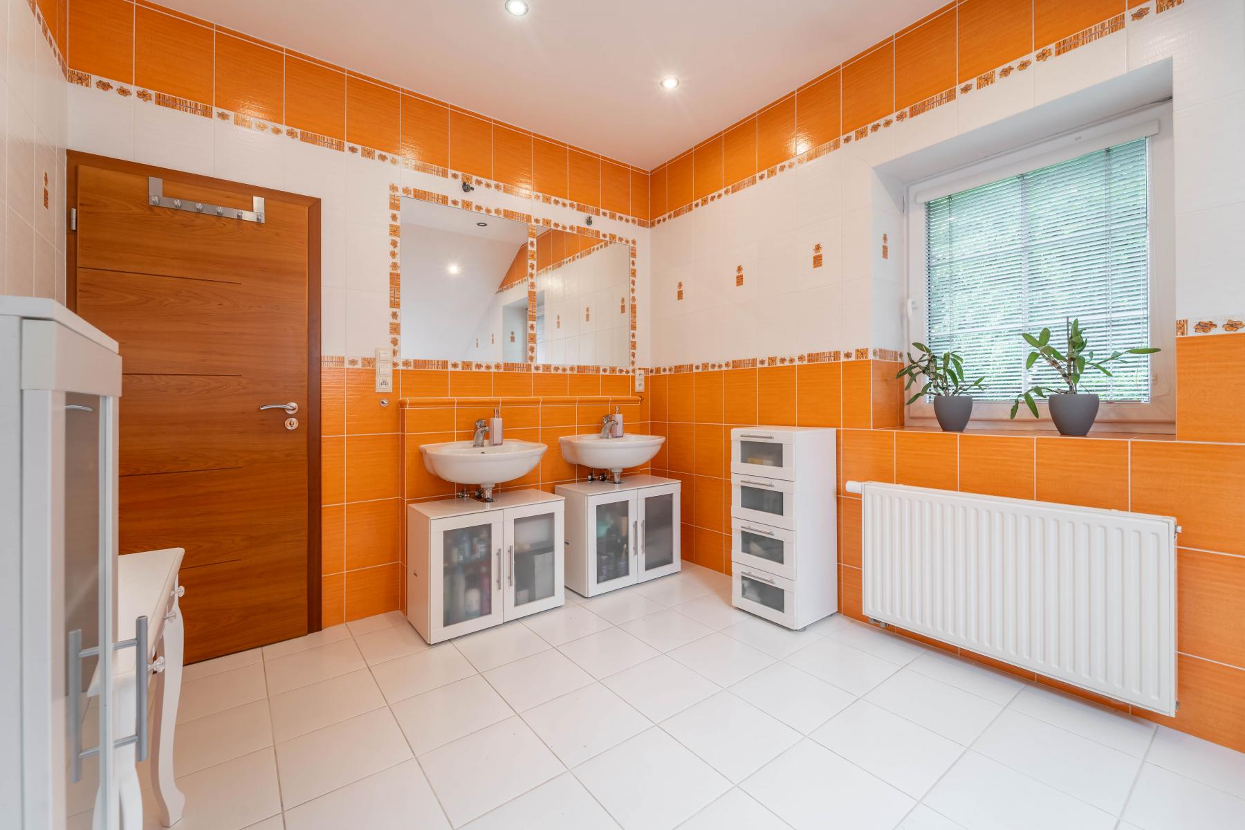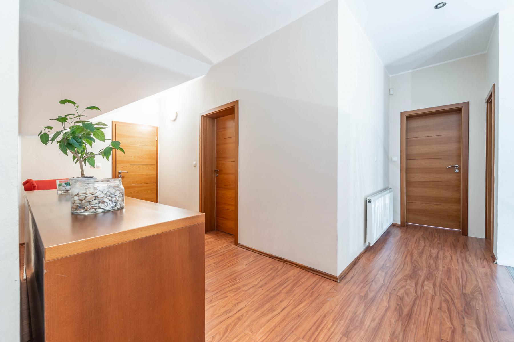 Dále zde najdete pracovnu, ložnici pro hosty, koupelnu s vanou i sprchovým koutem, samostatnou toaletu a spíž.