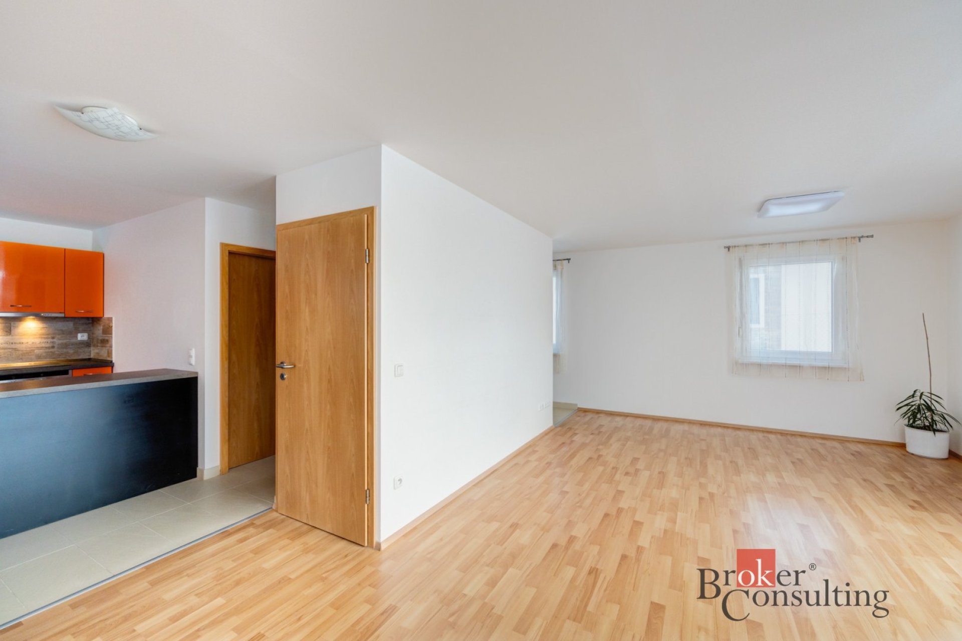 Po vstupu do domu se nachází předsíň, ze které se vstupuje do hlavního obytného prostoru. Ten tvoří velkorysý obývací pokoj propojený s kuchyní, která je laděna do výrazné oranžové barvy a dodává prostoru energii a moderní charakter. Obytný prostor působí velmi otevřeně a je ideálním místem pro každodenní rodinný život i setkávání s přáteli.