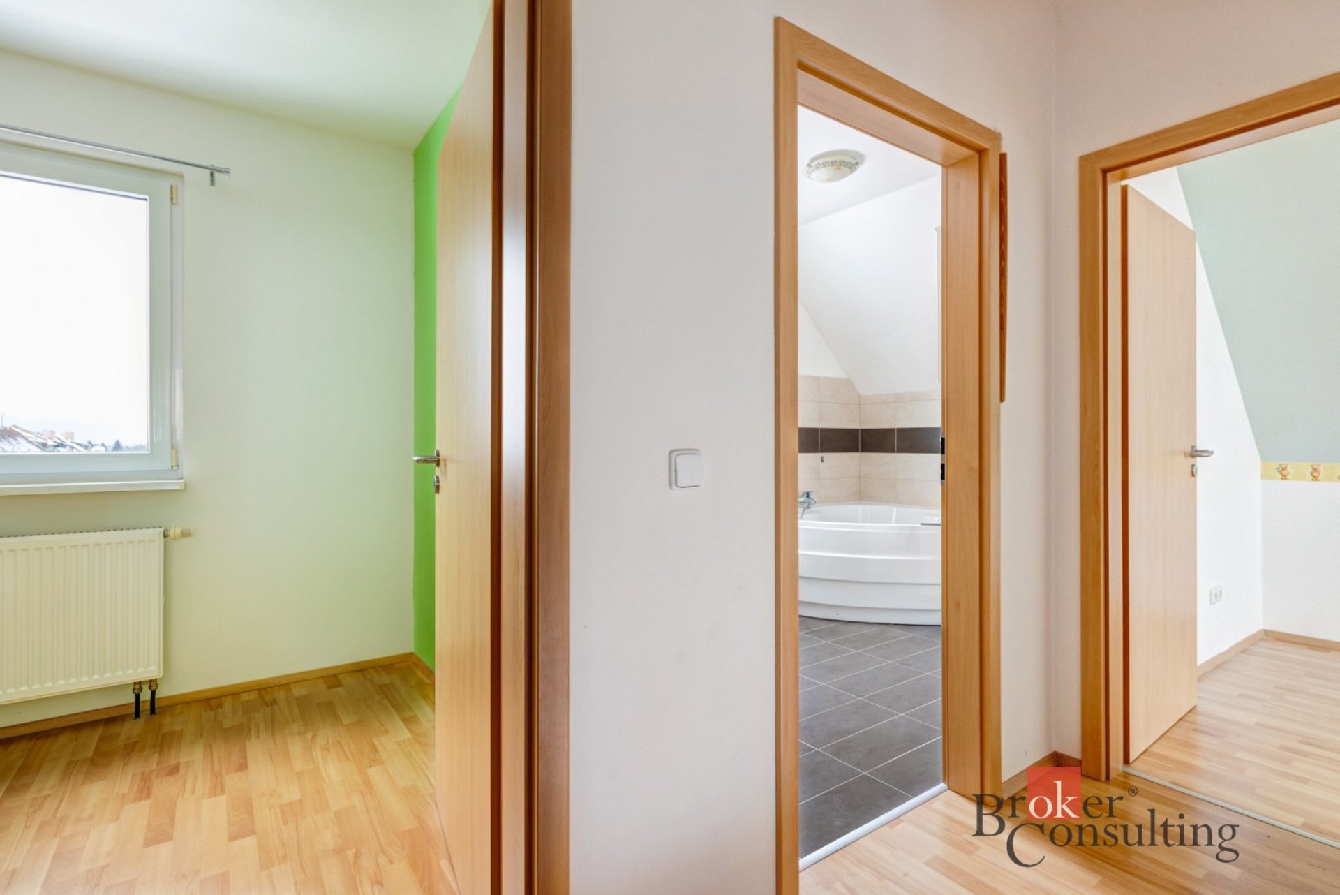 Po schodišti se dostanete do 1. patra, kde je klidová část domu. Najdete zde tři samostatné ložnice, které mohou sloužit jako dětské pokoje, ložnice, pracovna nebo pokoj pro hosty. Dominantou patra je prostorná koupelna, která nabízí skutečný komfort – nachází se zde velká rohová vana i sprchový kout a díky velikosti působí velmi vzdušně a komfortně.
