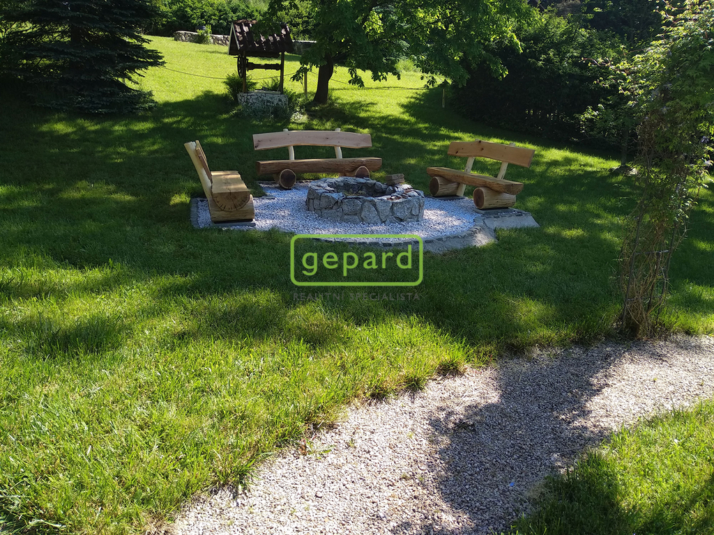 Mírně svažitý pozemek, kompletně oplocen, masivní kamenné opěrné zdi, regulovaný potok s jezírkem, koupací rybníček.