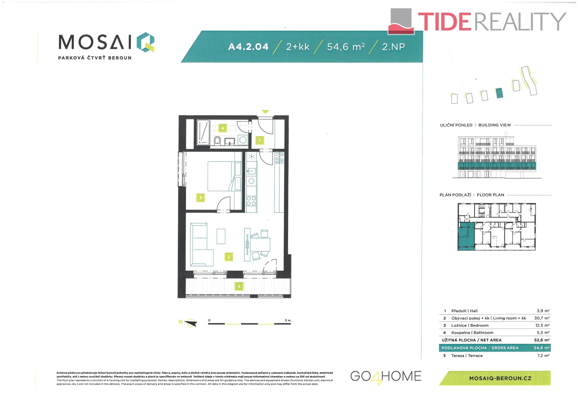 Tento svého druhu již poslední volný byt 2+kk se nachází v novém rezidenčním projektu MOSAIQ Beroun. Doplatek kupní ceny ve výši 85% je hrazen až po kolaudaci ve 4Q 2027. Jedná se o slunný rohový byt, který nabízí moderní obytný prostor s praktickým uspořádáním – dominantou je obývací pokoj propojený s kuchyňským koutem, odkud se vstupuje přímo na slunnou, západně orientovanou terasu. Druhý pokoj, klidná ložnice, je situován do klidného vnitrobloku s parkovou úpravou. Dispozici doplňuje koupelna s toaletou a vstupní hala s dostatkem místa pro šatní skříň. Celý byt působí díky dvěma vstupům na terasu a výhledu do parku vzdušně. Podlahová plocha činí příjemných 55 m² + terasa 7 m2, celková plocha tedy činí 62 m². Byt je situovaný v 2. nadzemním podlaží komorní budovy A4. Standardní vybavení jednotky zahrnuje plovoucí podlahy, interiérové dveře s výškou 210 cm, moderní vybavení koupelen, okna s barevným rámem a izolačním trojsklem, přípravu na vnější žaluzie. V bytech budou moderní datové rozvody formou strukturované kabeláže a přípojka STA. V projektu bude využita smart technologie pro vytápění, která pracuje se dvěma tepelnými zdroji – tepelnými čerpadly a zemním plynem. Dostatečná kapacita parkovacích míst převážně v podzemních garážích, ale i venku. K bytu je možné dokoupit sklepní jednotku.