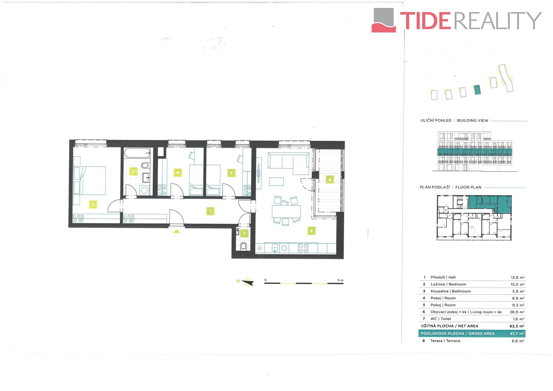 Tento konkrétní byt o podlahové ploše 83 m2 s terasou 6.6m2, se nachází ve 3.NP pětipodlažní budovy a má velmi příjemnou jihovýchodní orientaci. V současné chvíli ještě můžete zvolit mezi variantami dispozice 4+kk nebo 3+kk. Každá bytová jednotka 3,4,5+kk má na výběr také min. 2 parkovací stání: venkovní/vnitřní, která nejsou zahrnuta v ceně bytu a dále si je možné k větším bytům dokoupit také sklep. U větších bytů lze vybírat dispozice 3,4,5+kk v rozmezí 88 až 120m2 i ve vyšších patrech a s prostornými terasami. V současné chvíli je možné jednotky přizpůsobit i některým Vašim specifickým požadavkům, proto nás neváhejte co nejdříve kontaktovat.