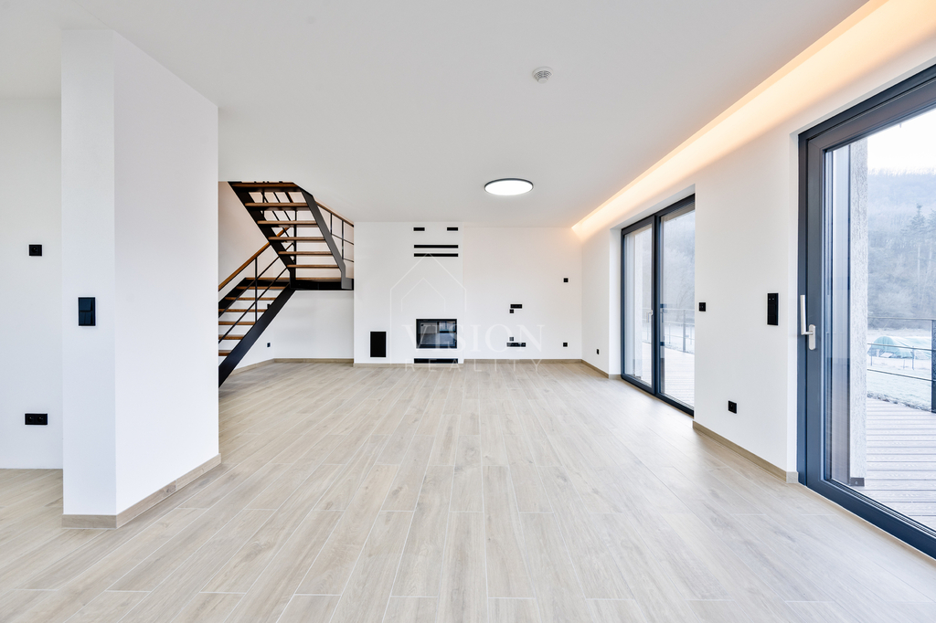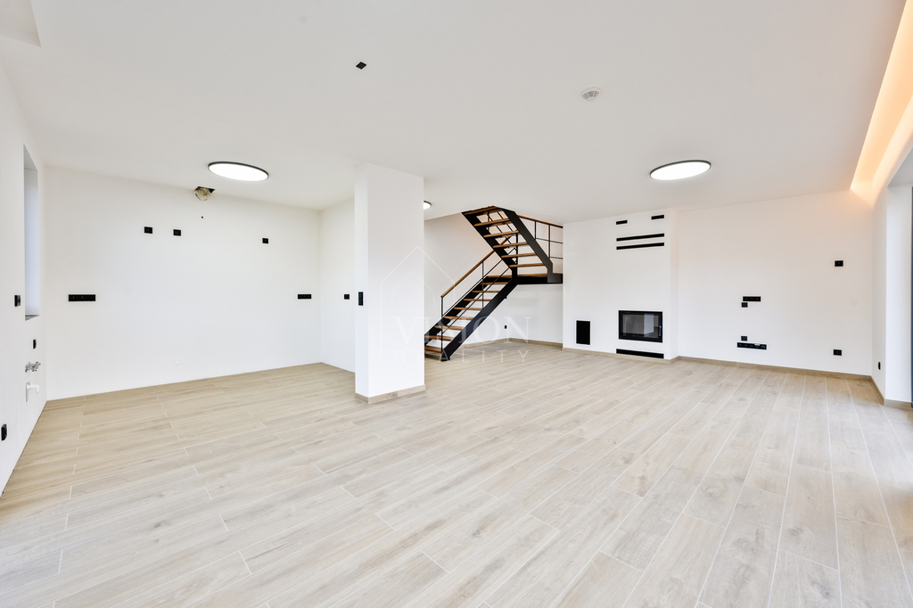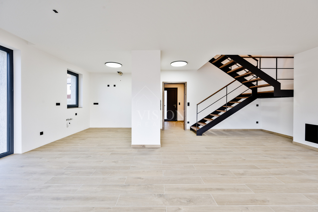 Výrazným designovým prvkem je vnitřní schodiště s ocelovou konstrukcí v černém provedení, doplněné masivními dubovými stupni a madlem zábradlí, které působí elegantně a nadčasově.