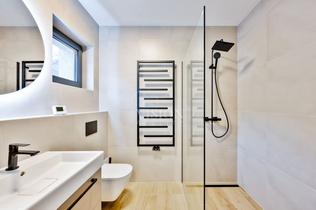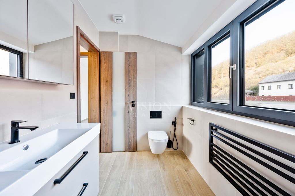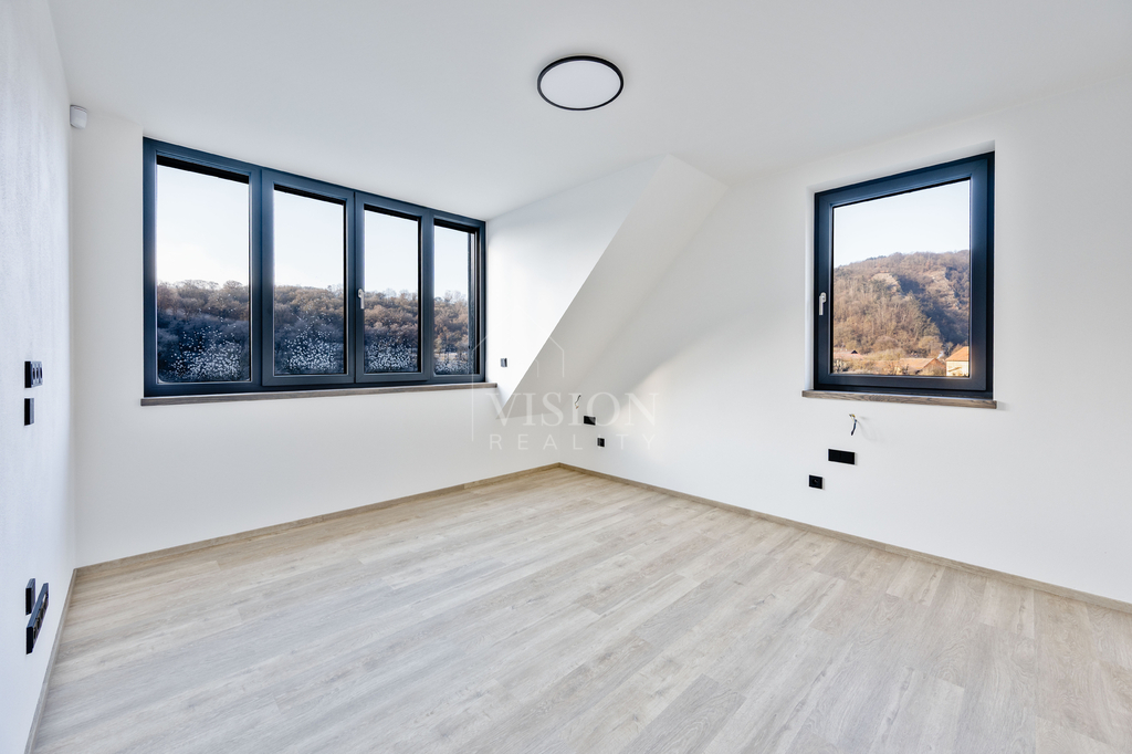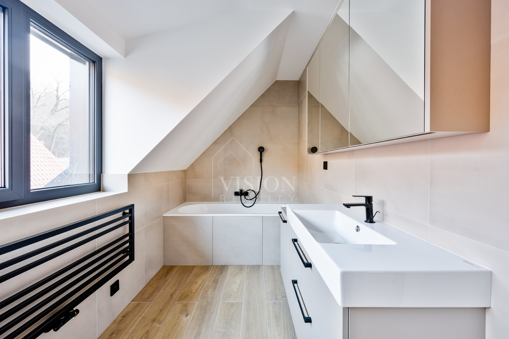 Podlahy v ložnicích jsou řešeny kvalitním vinylem, koupelny jsou obloženy velkoformátovým keramickým obkladem a vybaveny designovými bateriemi značky Hansgrohe. Vnitřní parapety z masivního dřeva s mořením podtrhují celkový standard interiéru.