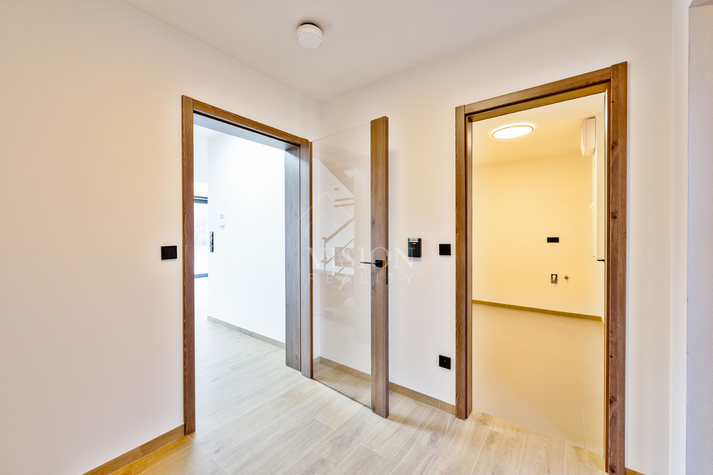 Interiér je řešen s důrazem na moderní design a funkčnost. Sádrové omítky, lité podlahy v přízemí a na chodbě ve 2. NP a sádrokartonové podhledy vytvářejí vzdušnou a harmonickou atmosféru. Plast-hliníková okna a dveře s izolačními trojskly jsou samozřejmostí, stejně jako vnější žaluzie s elektrickým ovládáním na jihozápadní straně domu, které zajišťují tepelný komfort i soukromí.
