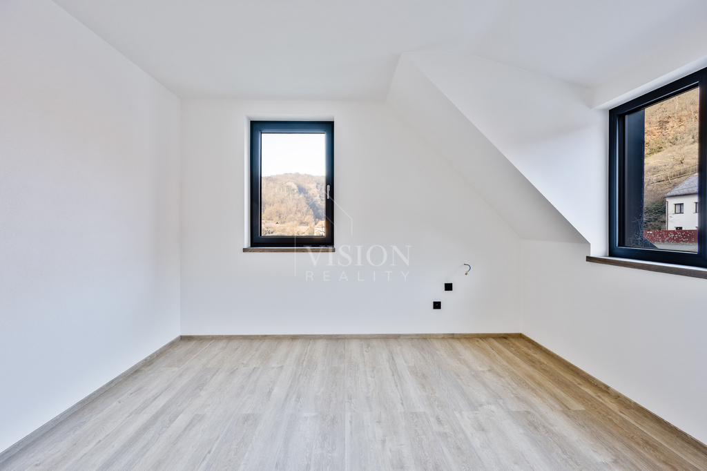 Ve druhém nadzemním podlaží jsou umístěny tři pokoje a koupelna s vanou. Nádherný výhled z každého pokoje je opravdu zaručen.