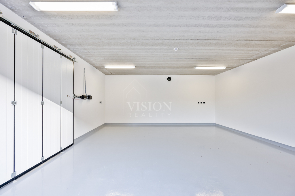 V přízemí se nachází velký světlý obývací pokoj s přímým vstupem na terasu prostřednictvím bezprahového HS portálu, který zajišťuje dostatek denního světla a přirozeně propojuje interiér se zahradou. V obývacím pokoji se nachází krb a kvalitní dubové schody. Pokoj je propojen s prostorným kuchyňským koutem. Ve spodním patře dále najdete koupelnu se sprchovým koutem, chodbu a technickou místnost, kde je dostatek prostoru pro uložení věcí nebo si vytvořit vysněnou šatnu.