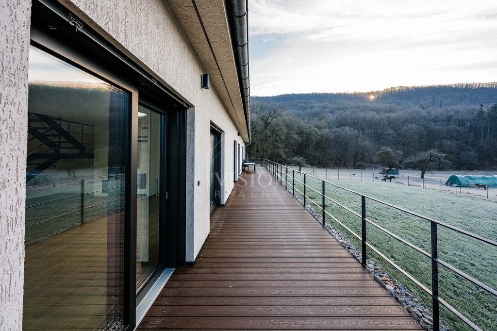 Terasa je provedena z WPC terasových prken a doplněna o ocelové žárově zinkované zábradlí s kamenným gabionem z nedalekého lomu, což vytváří příjemné místo pro relaxaci a posezení s rodinou či přáteli. Celková plocha pozemku poskytuje dostatek prostoru pro zahradu, odpočinek i další využití dle vlastních představ.