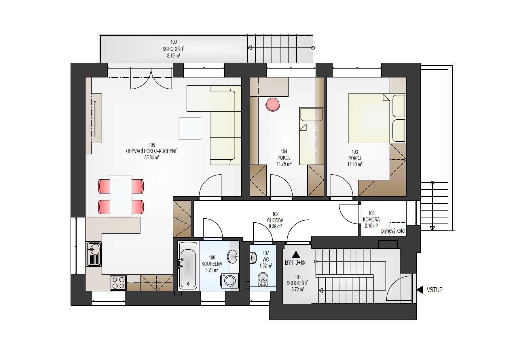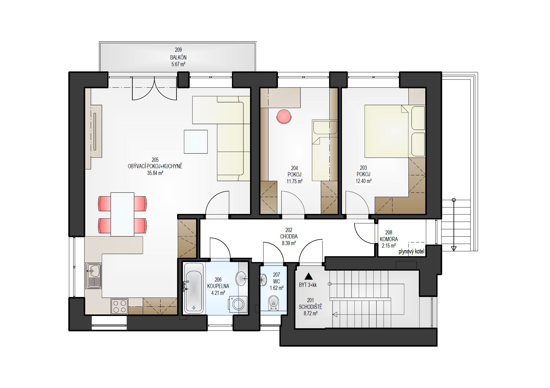 2.NP byt 3+kk: celková výměra bytu 86,94 m2, pokoj 12,40 m2, pokoj 11,75 m2, kuchyně s obývacím pokojem 35,84 m2, předsíň 8,17 m2, koupelna s vanou 4,21 m2, samostatné WC 1,57 m2, komora 2,15 m2, balkon 5,67 m2. K bytu náleží zahrada o celkové výměře 170 m2, sklep 5,18 m2 a parkovací místo před domem o výměře 14 m2.