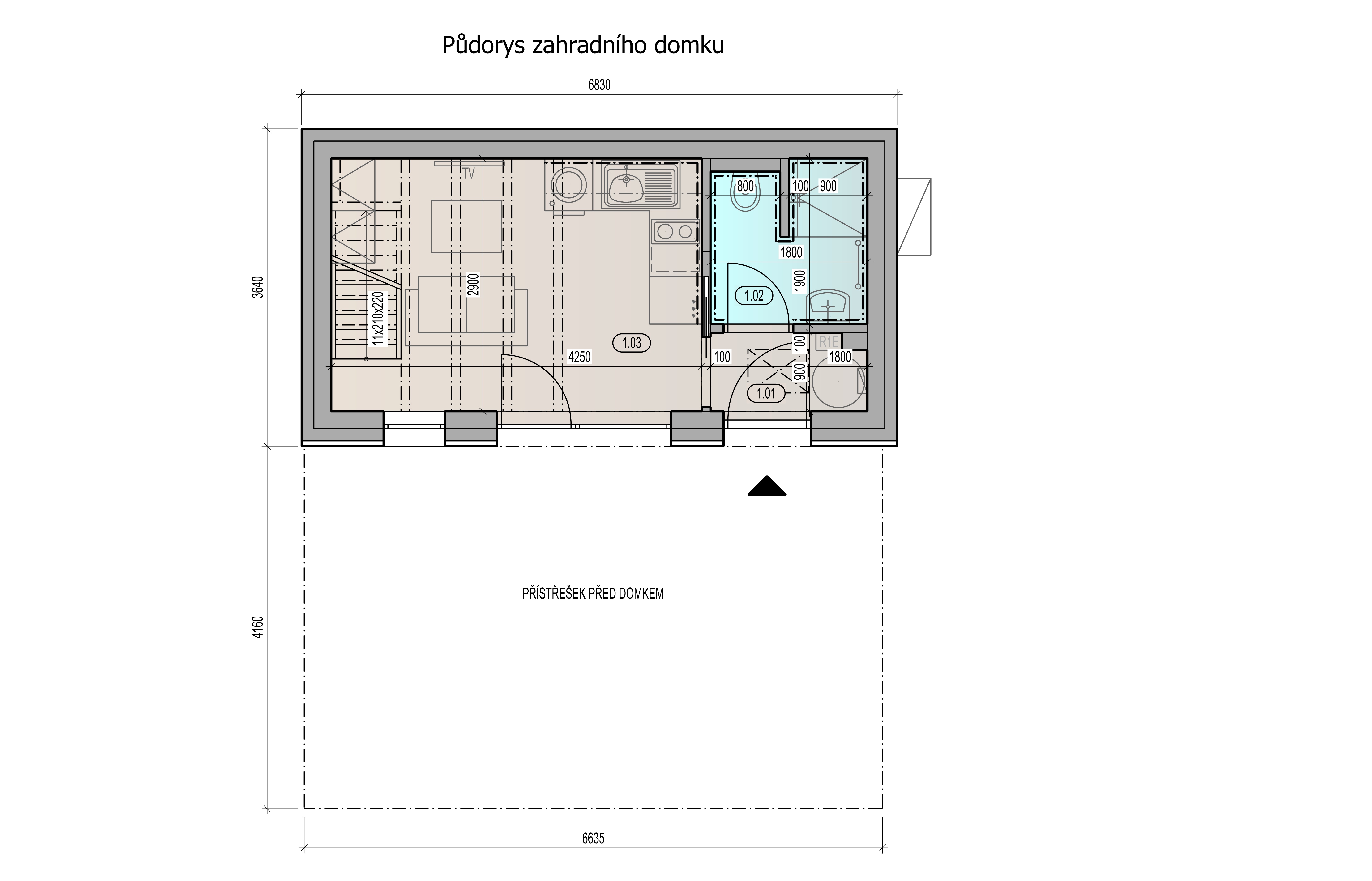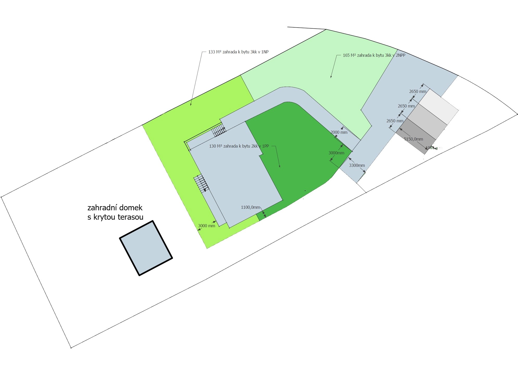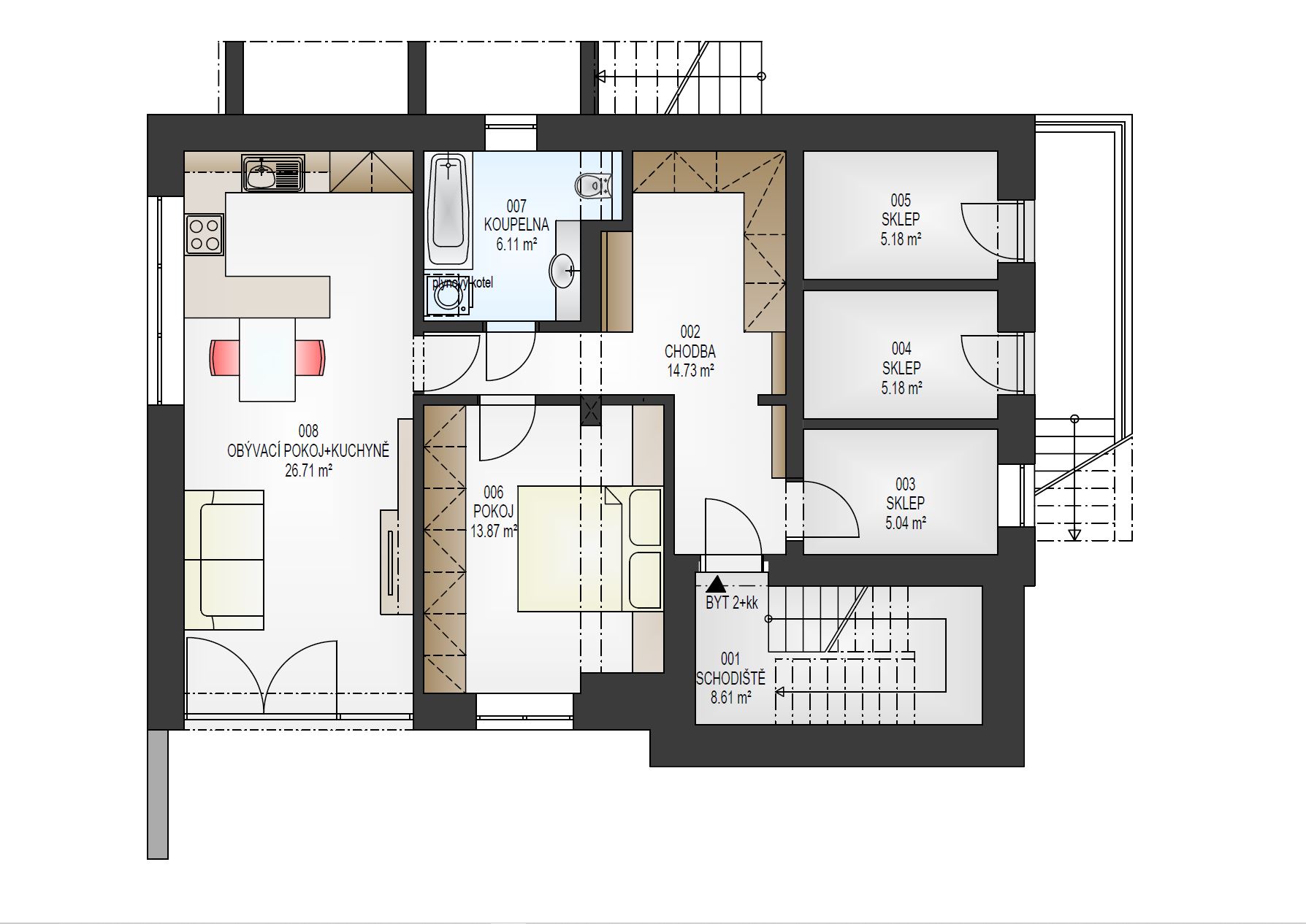 Bytový dům: 1.PP byt 2+kk: celková výměra bytu 66,46 m2, pokoj 13,87 m2, kuchyně s obývacím pokojem 26,71 m2, předsíň 14,73 m2, koupelna s vanou a WC 6,11 m2, šatna 5,04 m2. K bytu náleží zahrada o celkové výměře 152 m2 a parkovací místo před domem o výměře 14 m2.