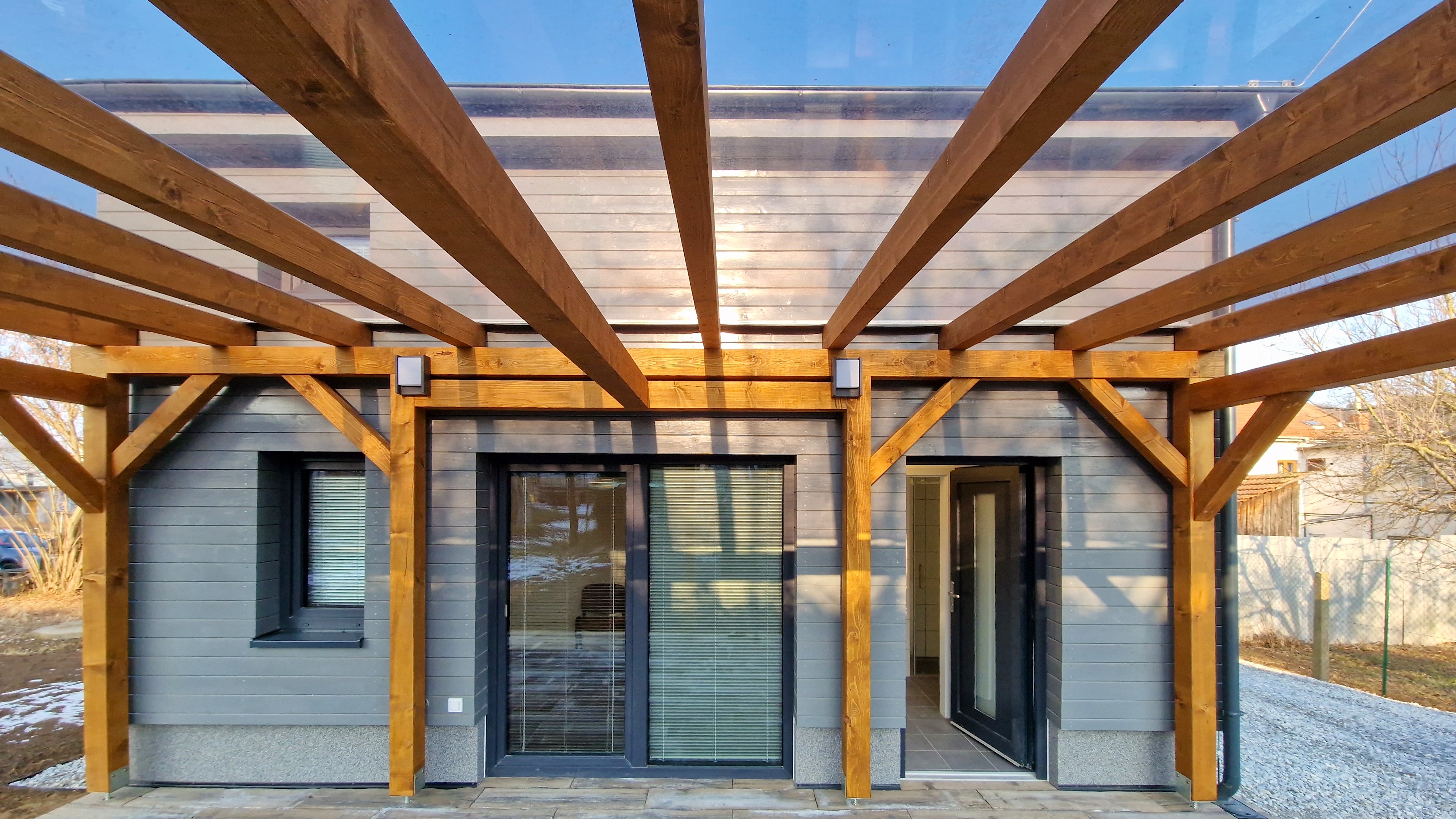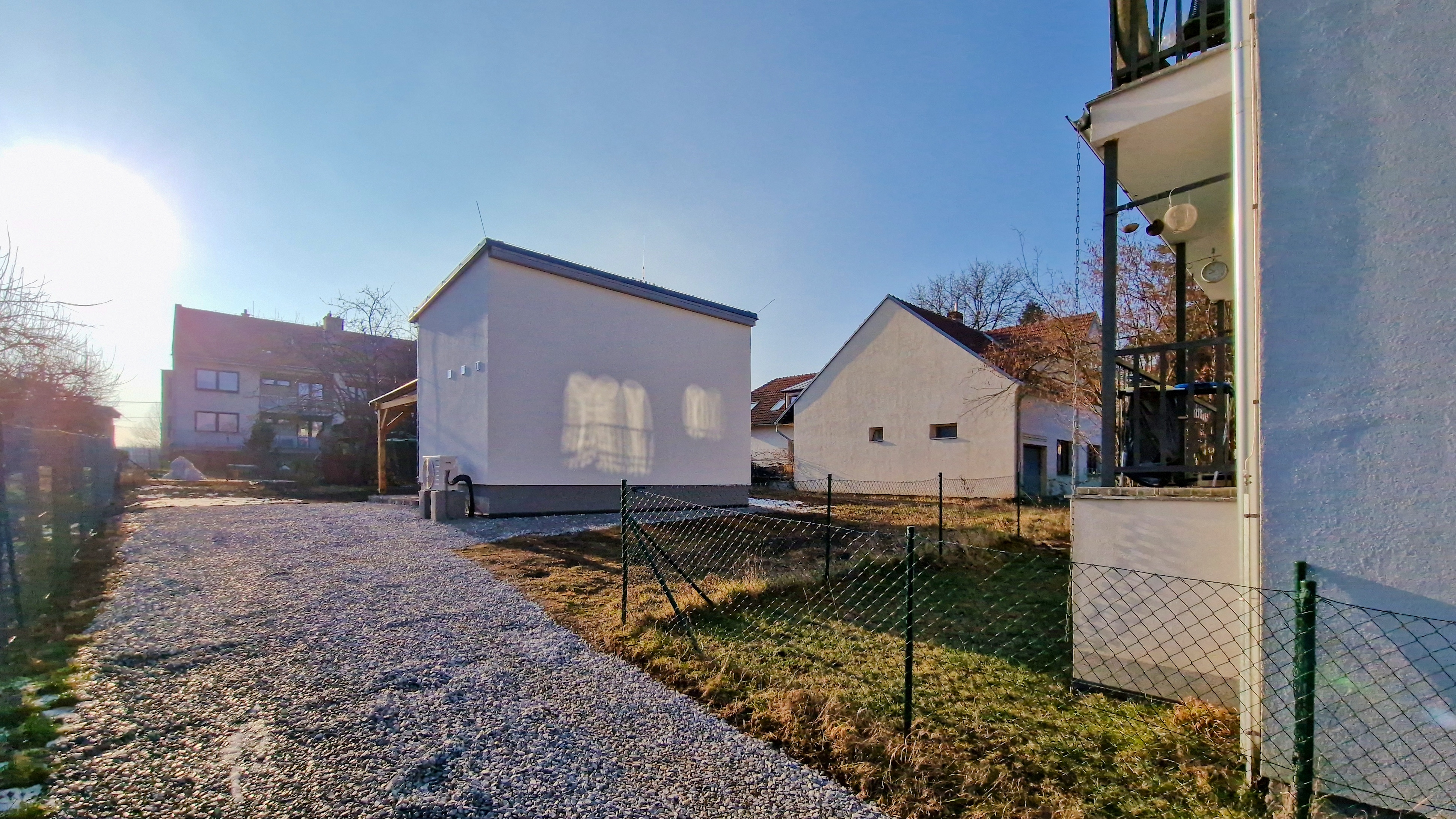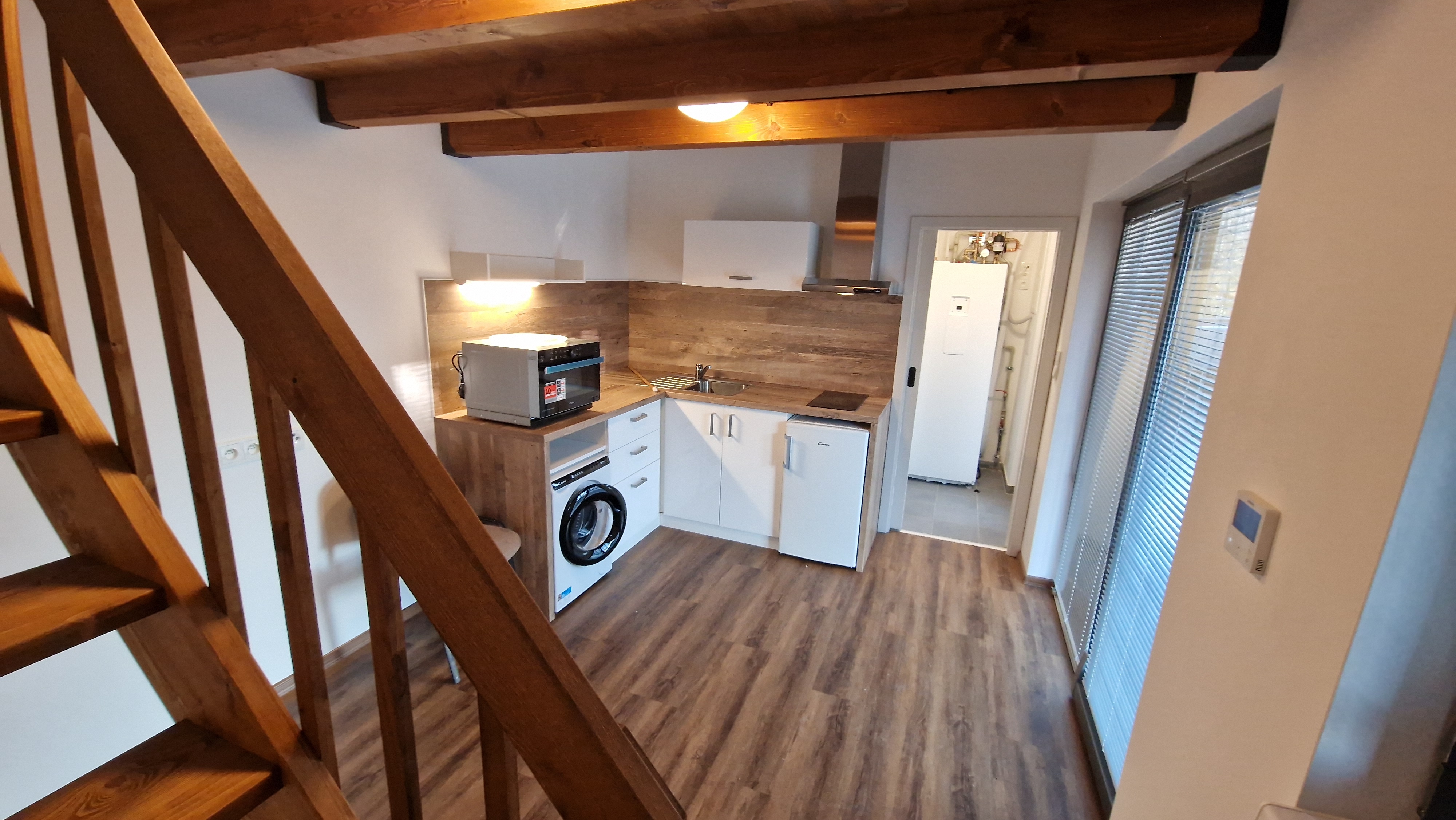 Součástí prodeje ji i novostavba menšího samostatně stojícího domku s krytou terasou o zastavěné ploše 25 m2 v zadní části pozemku. Domek je jakou součást hlavní stavby. Dům je vybaven tepelným čerpadlem pro vytápění a ohřev vody, koupelnou se sprchovým koutem, WC a umyvadlem. Kuchyňská linka včetně spotřebičů. Spaní je řešeno v podkrovní části domku s dřevěnou vestavěnou palandou.