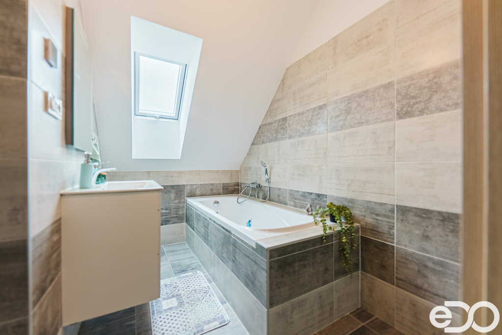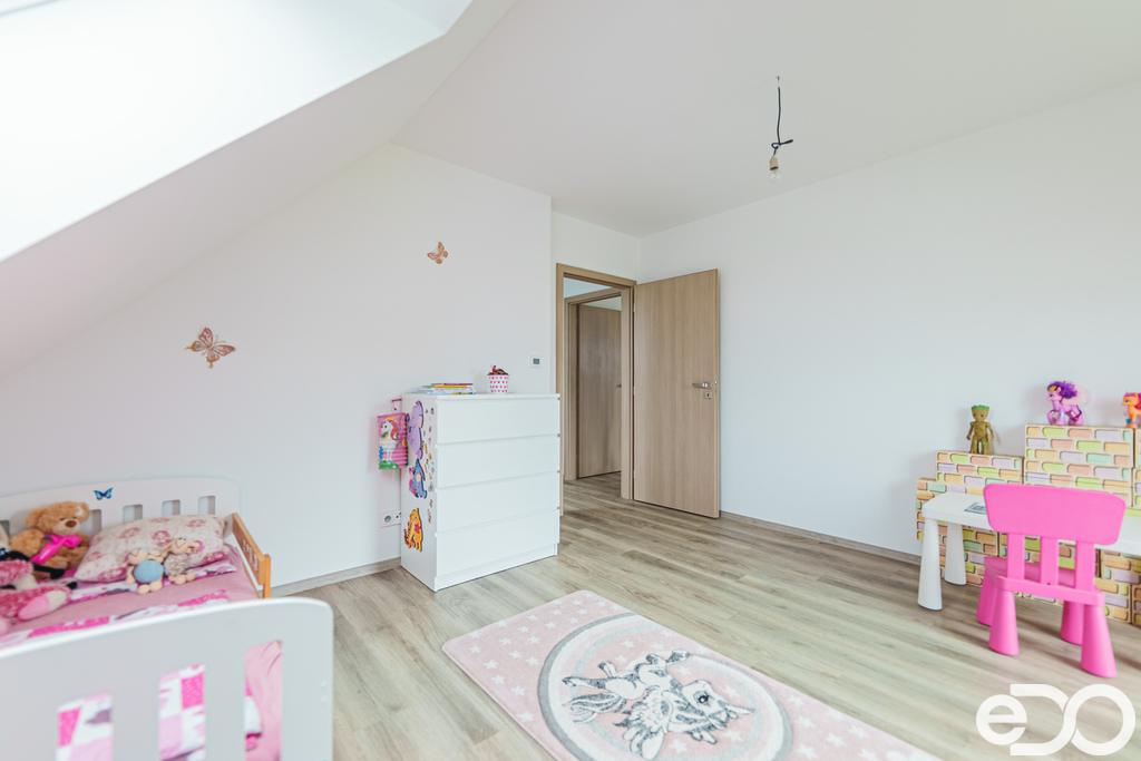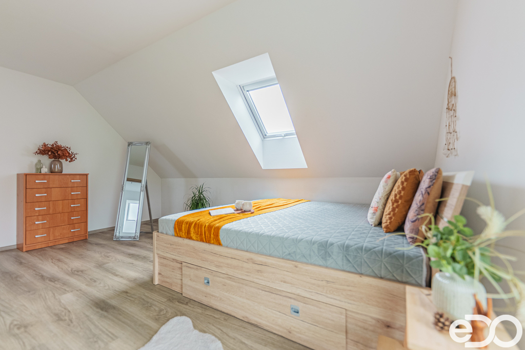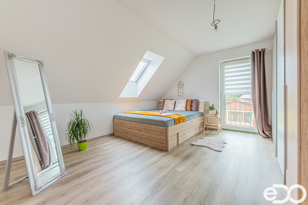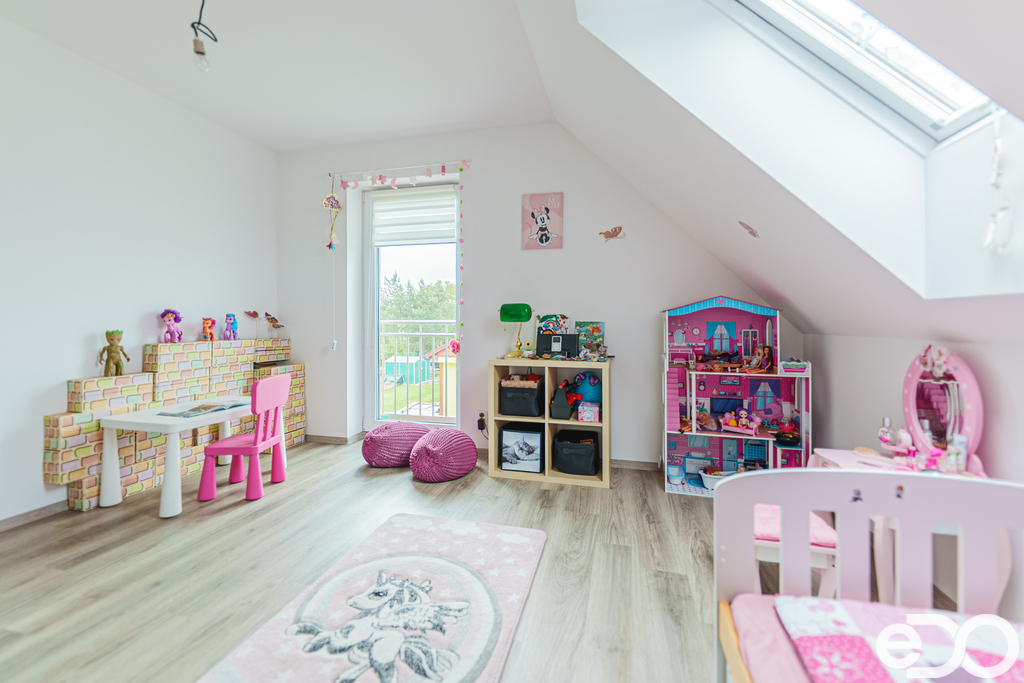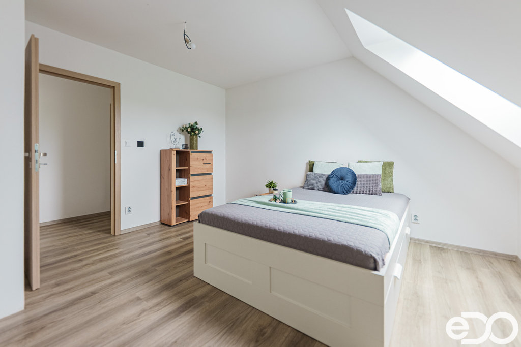 V patře jsou k dispozici tři pokoje a koupelna s vanou a WC. Součástí domu je také půdní prostor o velikosti cca 23 m², který nabízí další možnosti využití, například jako pracovnu, hernu nebo další ložnici. Nad prvním patrem se nachází ještě další půdní prostor, který není pochozí.