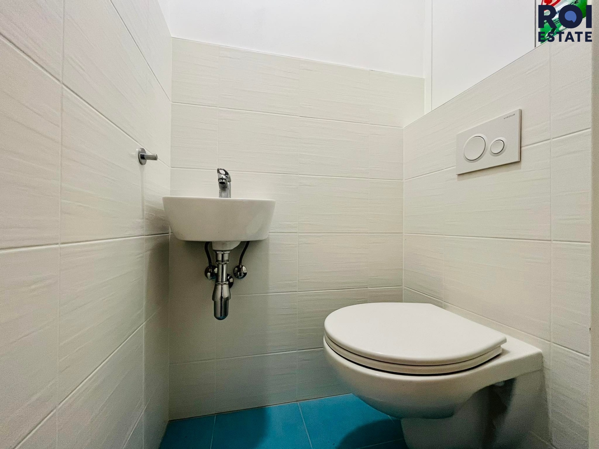 Koupelna působí svěže a elegantně – nabízí dostatek úložného prostoru a moderní vybavení, které potěší každého nájemníka. Toaleta je oddělená, což zvyšuje komfort užívání.
