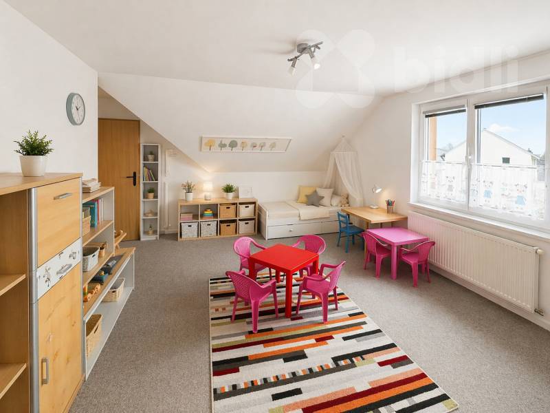 Podkroví rozšiřuje obytnou část domu o prostorný obývací pokoj s jídelním koutem, šatnu, ložnici, koupelnu, samostatné WC a další dva pokoje. Celkové uspořádání domu tak vyhoví větší rodině i zájemcům, kteří hledají dostatek prostoru, soukromí a variabilní využití jednotlivých místností.