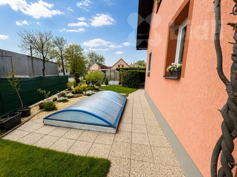 Příjemným bonusem je upravená zahrada s pergolou a zapuštěným krytým bazénem, která vytváří příjemné místo pro relaxaci.