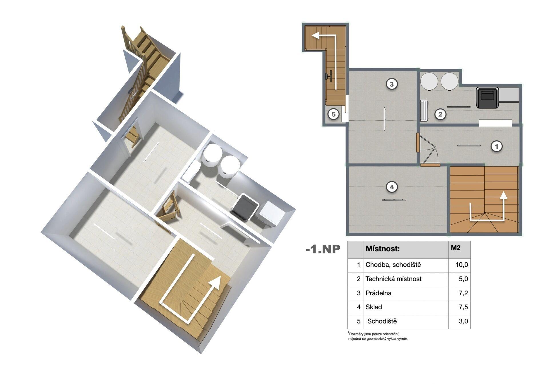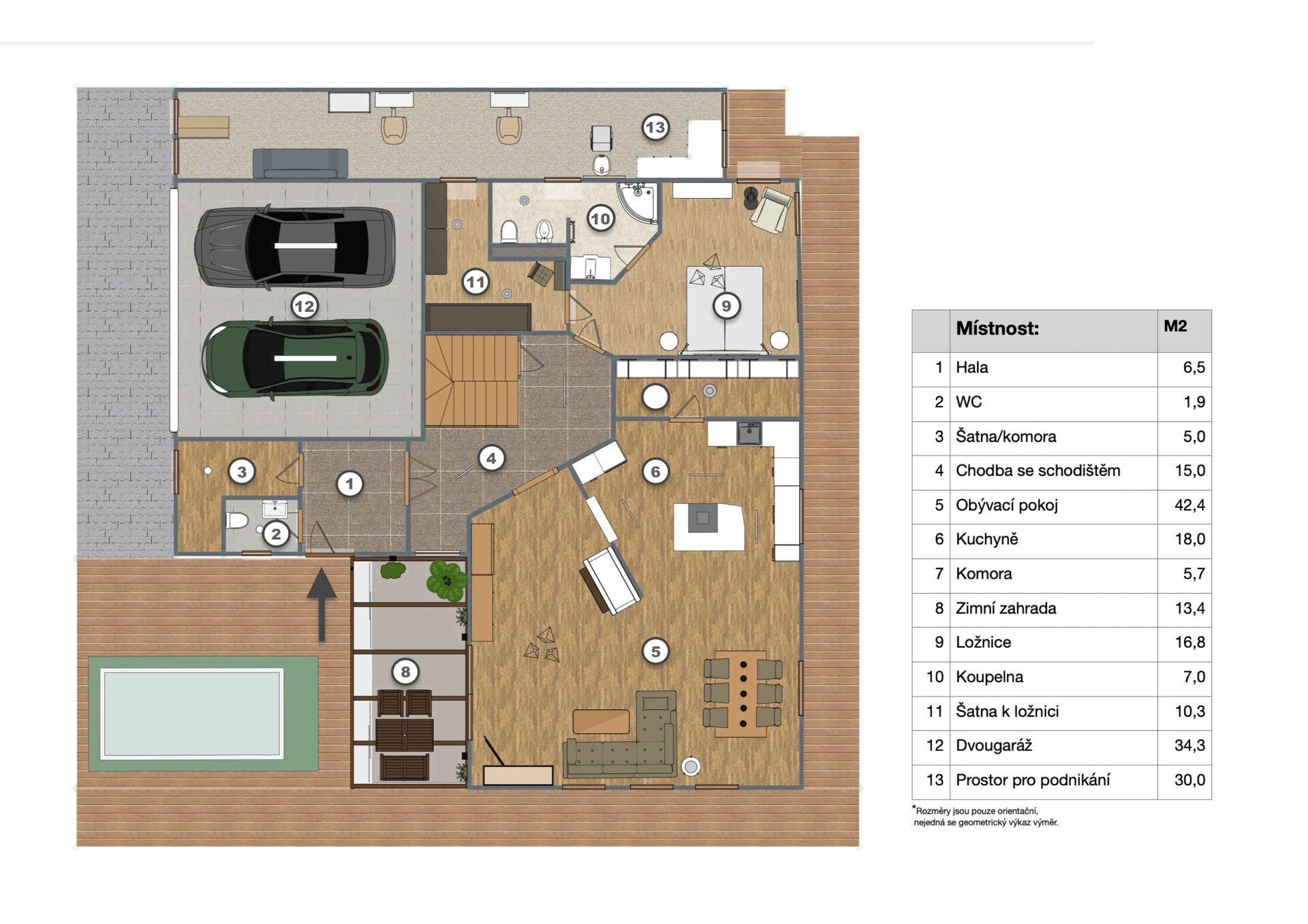 Zastavěná plocha domu činí přibližně 207 m², přičemž obytná plocha je rozdělena mezi přízemí, které má krásných 206,3 m², podkroví o výměře 129,4 m² a suterén (podsklepení), která má výměru 32,7 m². Celkově tak dům disponuje neuvěřitelnou výměrou 368,4 m². Dispozice zajišťuje dostatek prostoru nejen pro bydlení, ale i pro praktické fungování domácnosti, případně možnost využití přístavby u domu k podnikatelským záměrům.