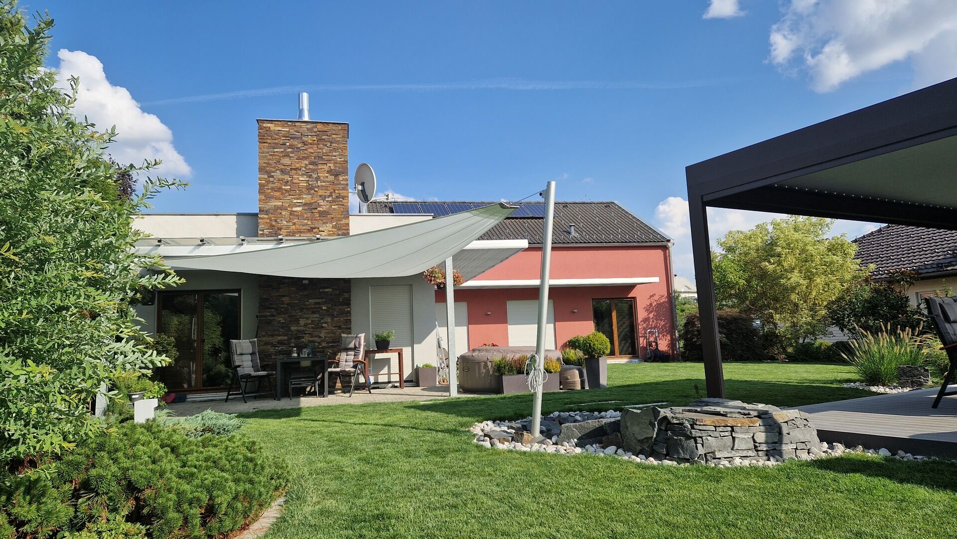 V zahradě je nově vybudováno sezení pod hliníkovou bioklimatickou pergolou s elektricky ovládanými stěnami a osvětlením, rolovací stínící