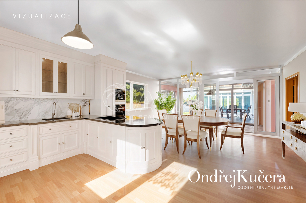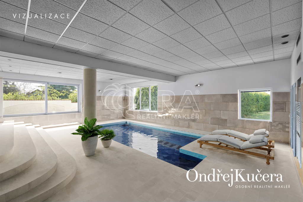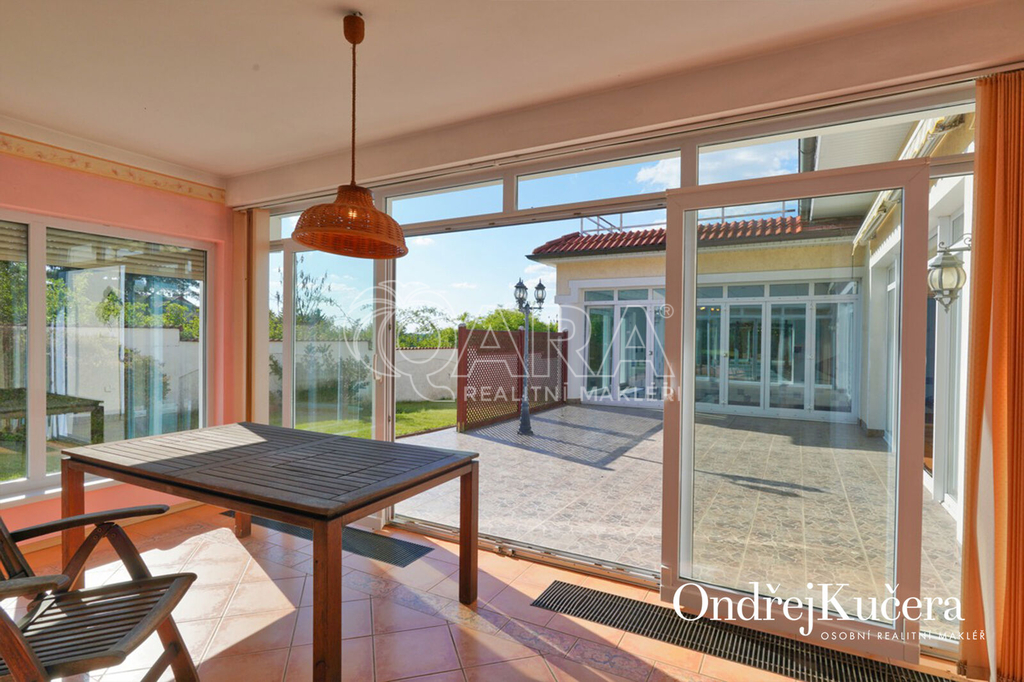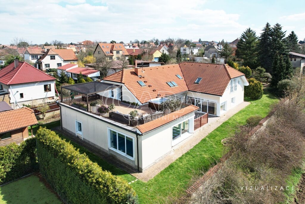 - Velkorysá dispozice 7+1, dvojgaráž, slunná terasa, zimní zahrada, krytý bazén, 85 m² střešní terasa s výhledem a mnoho dalšího.
