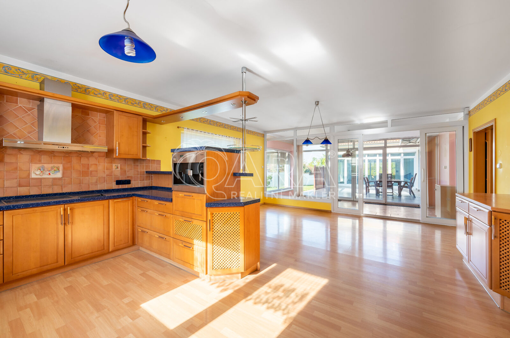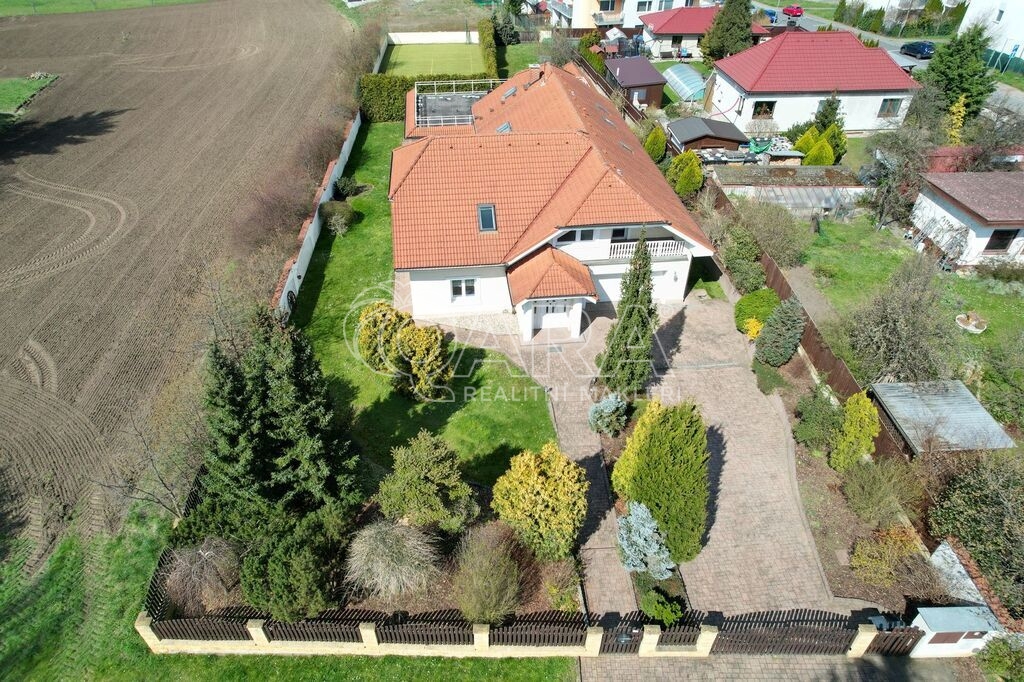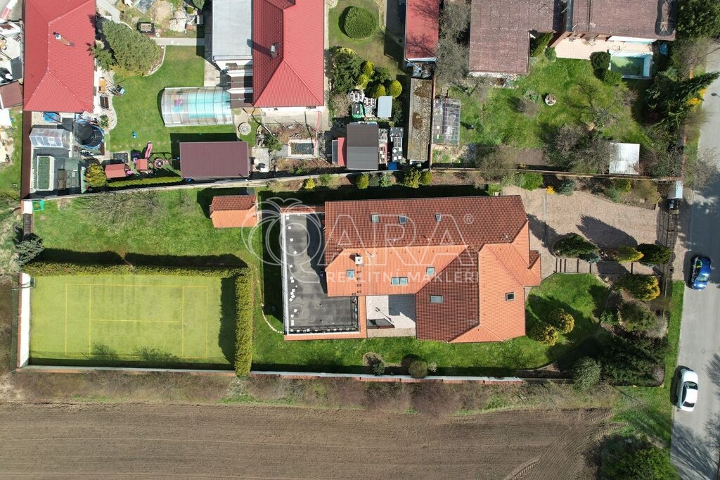 Tento cihlový dům s podlahovou plochou 435 m² byl postaven z kvalitních materiálů v roce 2002 jako promyšlené rodinné sídlo, kde je dostatek místa pro každého člena rodiny i hosty. Prakticky řešené propojení vnitřních i venkovních prostor nabízí naprosté soukromí i dokonalé zázemí pro setkávání, ať už v obývacím pokoji u rodinného krbu, v kuchyni s jídelnou a zimní zahradou, nebo na slunné terase s markýzou, která navazuje na krytý bazén.