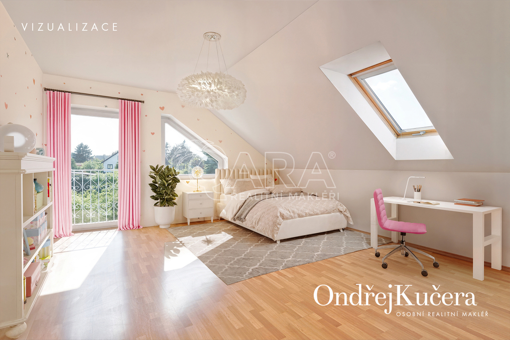 - Chytré členění: klidová zóna s ložnicemi, pracovnou, pokojem pro hosty či fitness je umístěna v patře. Hlavní ložnice má vlastní šatnu, koupelnu a balkon.