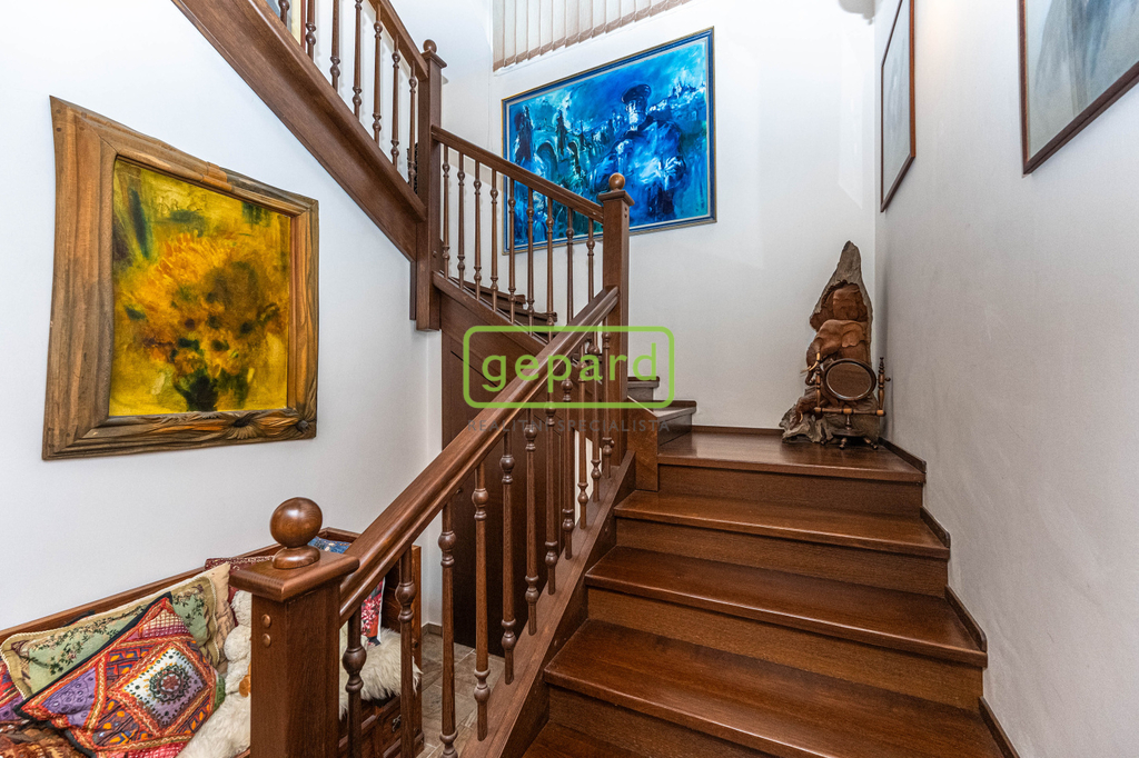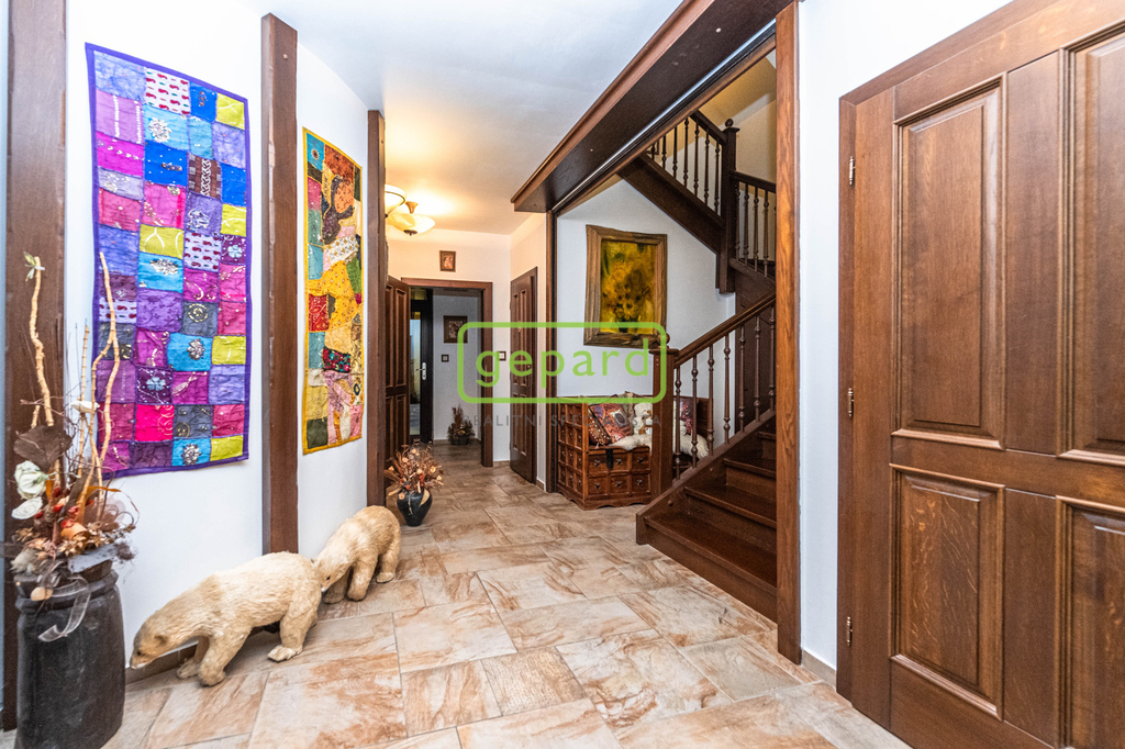 The highlight of the house is an indoor swimming pool with a counter-current system and dedicated air dehumidification, complemented by a private gym, fireplace, and three full bathrooms. The interior features high-quality, durable materials throughout, including wooden euro windows, a solid oak staircase, ceramic tiles, and wooden flooring, creating an elegant and long-lasting living environment.