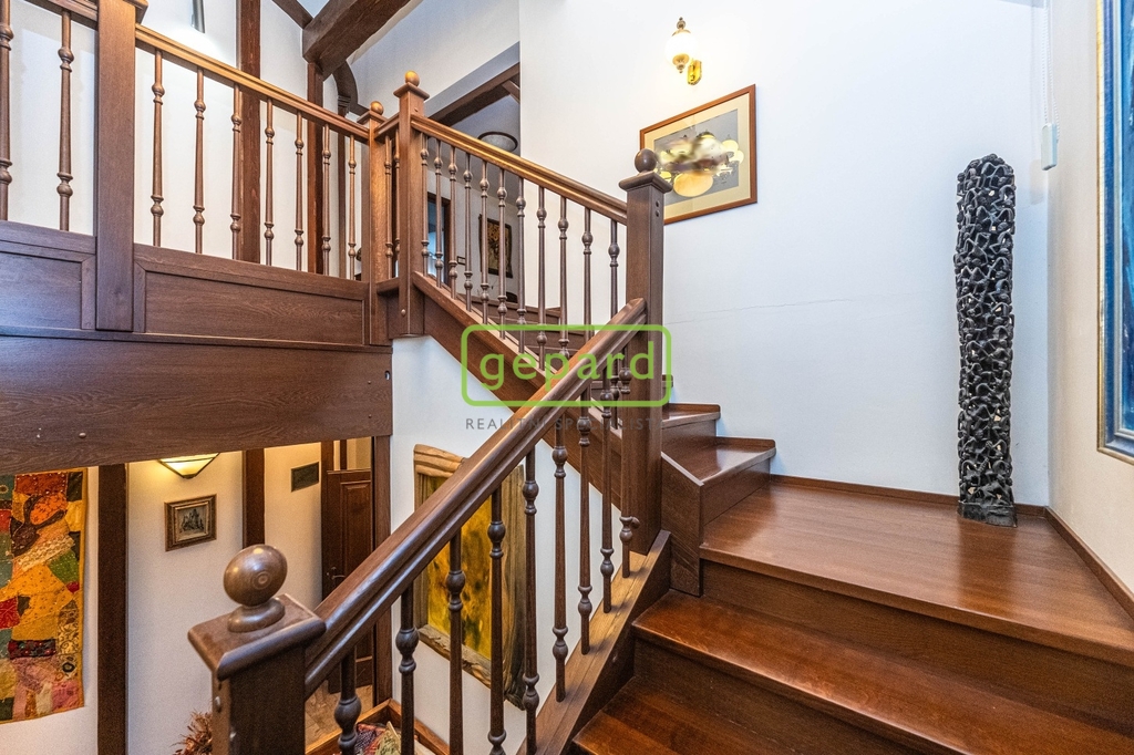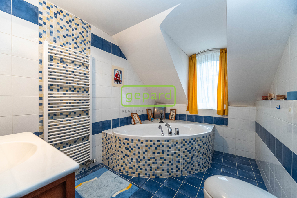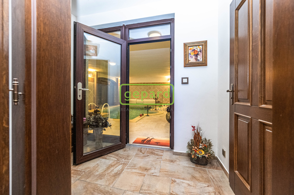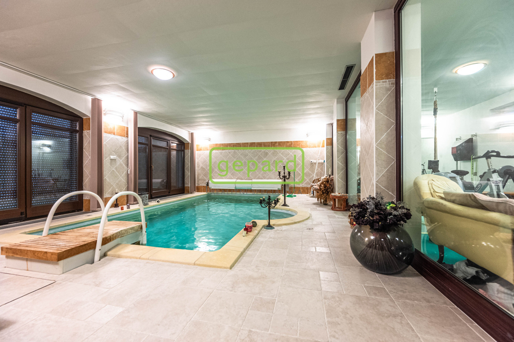 Dominantou domu je vnitřní bazén s protiproudem a samostatným odvlhčováním, dále posilovna, krb a tři plnohodnotné koupelny. Interiér je proveden z kvalitních a trvanlivých materiálů – dřevěná eurookna, masivní dubové schodiště, keramické dlažby a dřevěné podlahy – s důrazem na eleganci a dlouhodobou hodnotu.