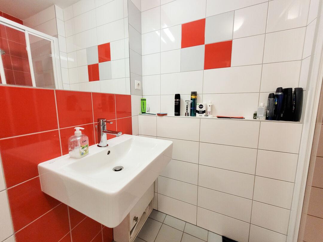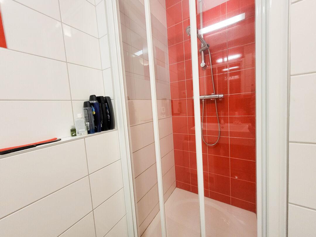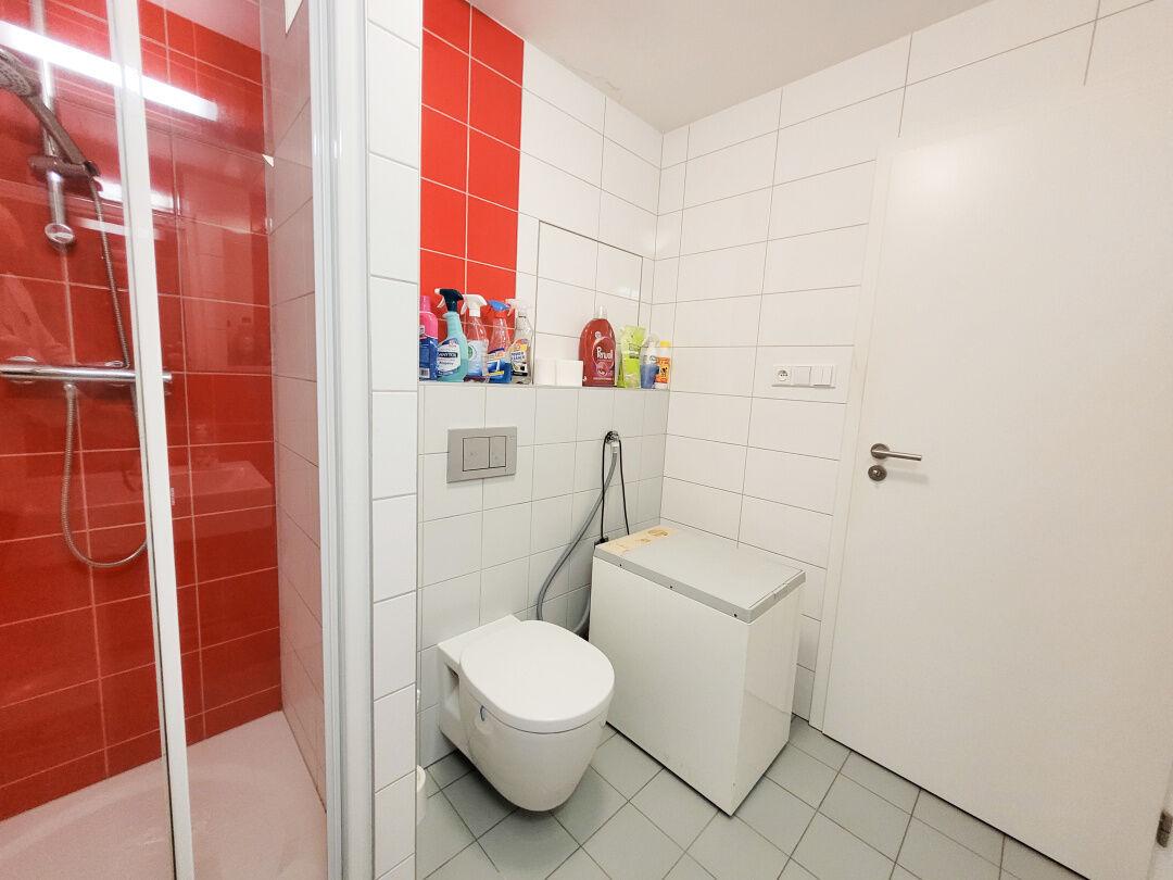Koupelna je vybavena sprchovým koutem, umyvadlem, toaletou a nechybí ani automatická pračka.