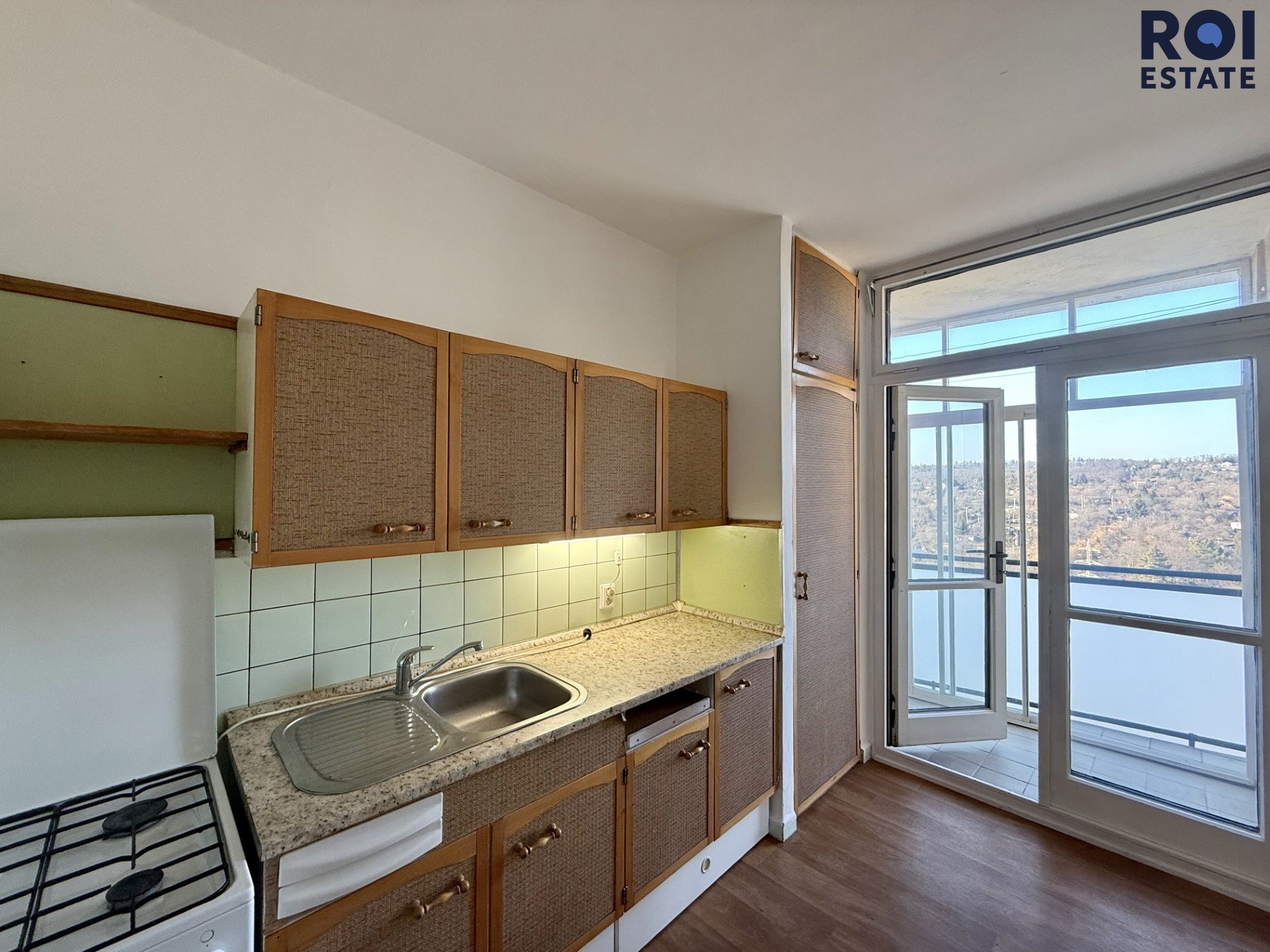 Dominantou bytu je obývací pokoj (18,1 m²), ze kterého je vstup do retro kuchyně. Ta je vybavena kuchyňskou linkou a plynovým sporákem a nabízí také vstup na lodžii.