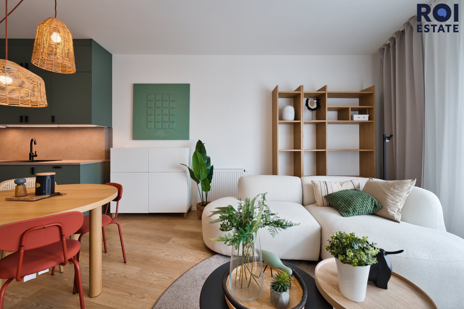 Vybavení bytu: vstupní chodba s úložným prostorem a předsíňovou stěnou, samostatná toaleta, koupelna se sprchovým koutem, pračkou a sušičkou; ložnice s kvalitní postelí, úložnými prostory, šatní skříní a stylovou tapetou; obývací pokoj s moderní kuchyňskou linkou na míru (olivová a cihlová terakota), jídelní kout, světlá sedací souprava, knihovna, stylové osvětlení