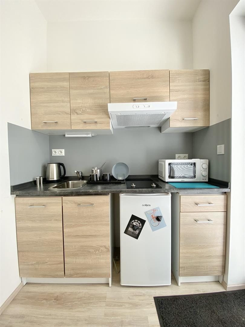 Jedná se o podnájem kompletně vybavené jednotky o dispozici 1+kk v zrekonstruovaném domě. Součástí vybavení kuchyně je plně zařízený kuchyňský kout, včetně lednice, sklokeramické desky, mikrovlnné trouby, varné konvice, digestoře a dřezu. Jednotka je vybavena pracovním stolem se židlemi, dvěma postelemi s nočními stolky a dostatečným prostorem na ukládání oblečení. Koupelna je také plně vybavená, a to sprchovým koutem, záchodem a umyvadlem se zrcadlem. K dispozici je příprava pro připojení vlastní pračky.