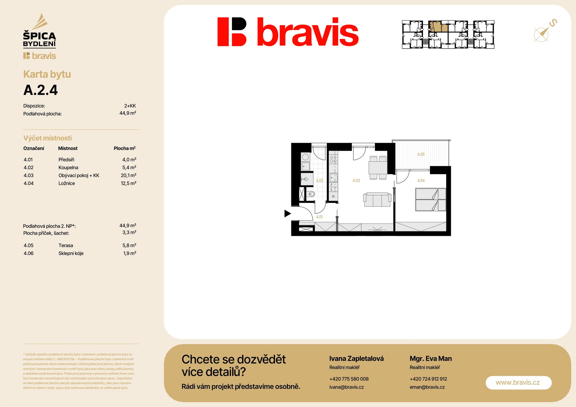 Nabízíme exkluzivní bytovou jednotku 2+kk (bytová jednotka A2-4) v novém projektu Špica bydlení — byt umístěný ve 2. NP nízkoenergetického bytového domu A. Celková podlahová plocha činí 44,9 m², navíc k ní náleží terasa 5,8 m², sklep a vlastní parkovací stání, což zajišťuje maximální komfort bez nutnosti dalších investic.