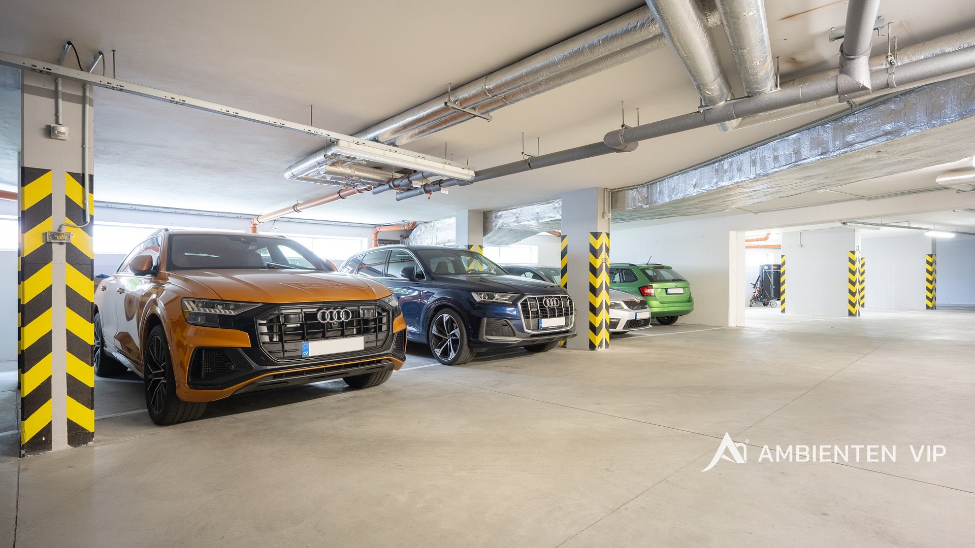 Součástí bytu je sklep o velikosti 4,5 m², prakticky umístěný na stejném patře, a dvě garážová stání vedle sebe s přímým přístupem k výtahu. Byt je napojen na centrální dálkové vytápění, které spolu s kvalitními okny a zateplením zajišťuje komfortní teplotu po celý rok.