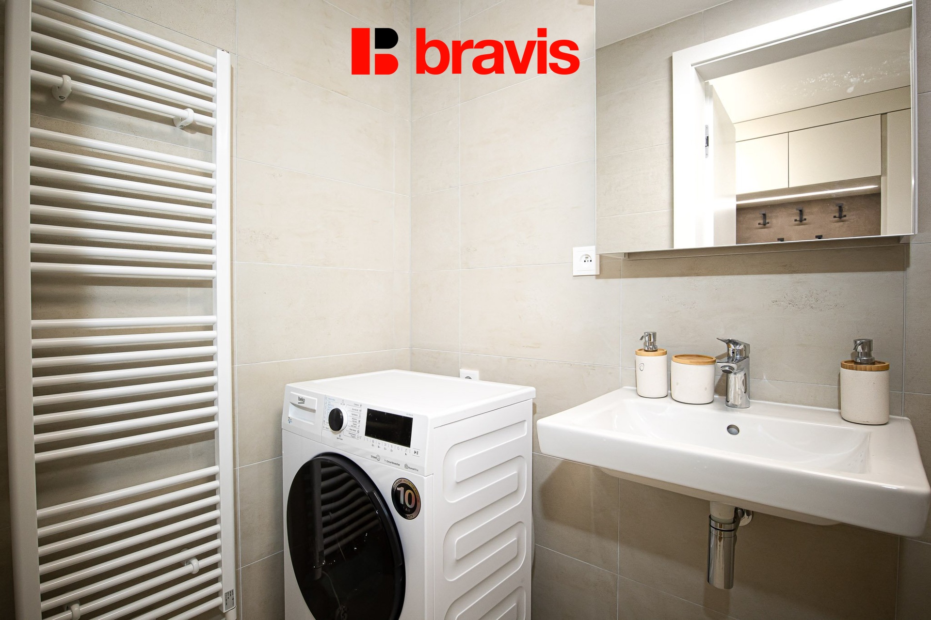 Koupelna je vybavena vanou, umyvadlem, otopným žebříkem a pračkou, toaleta je odděleně.
