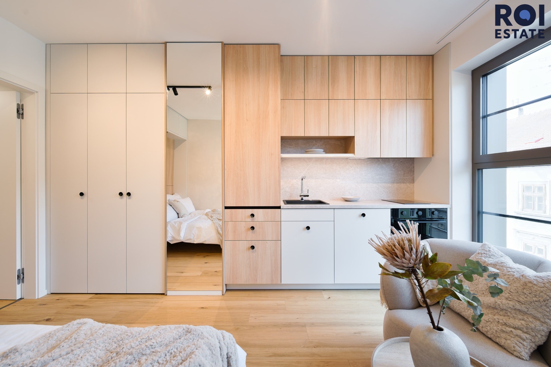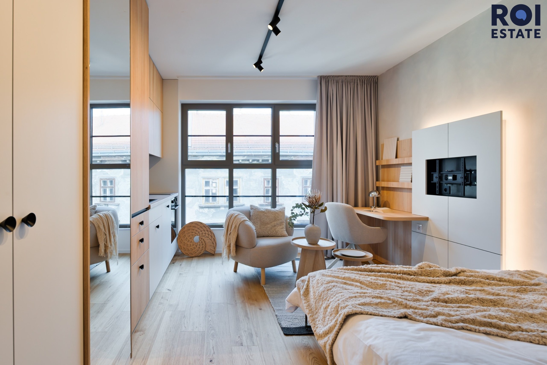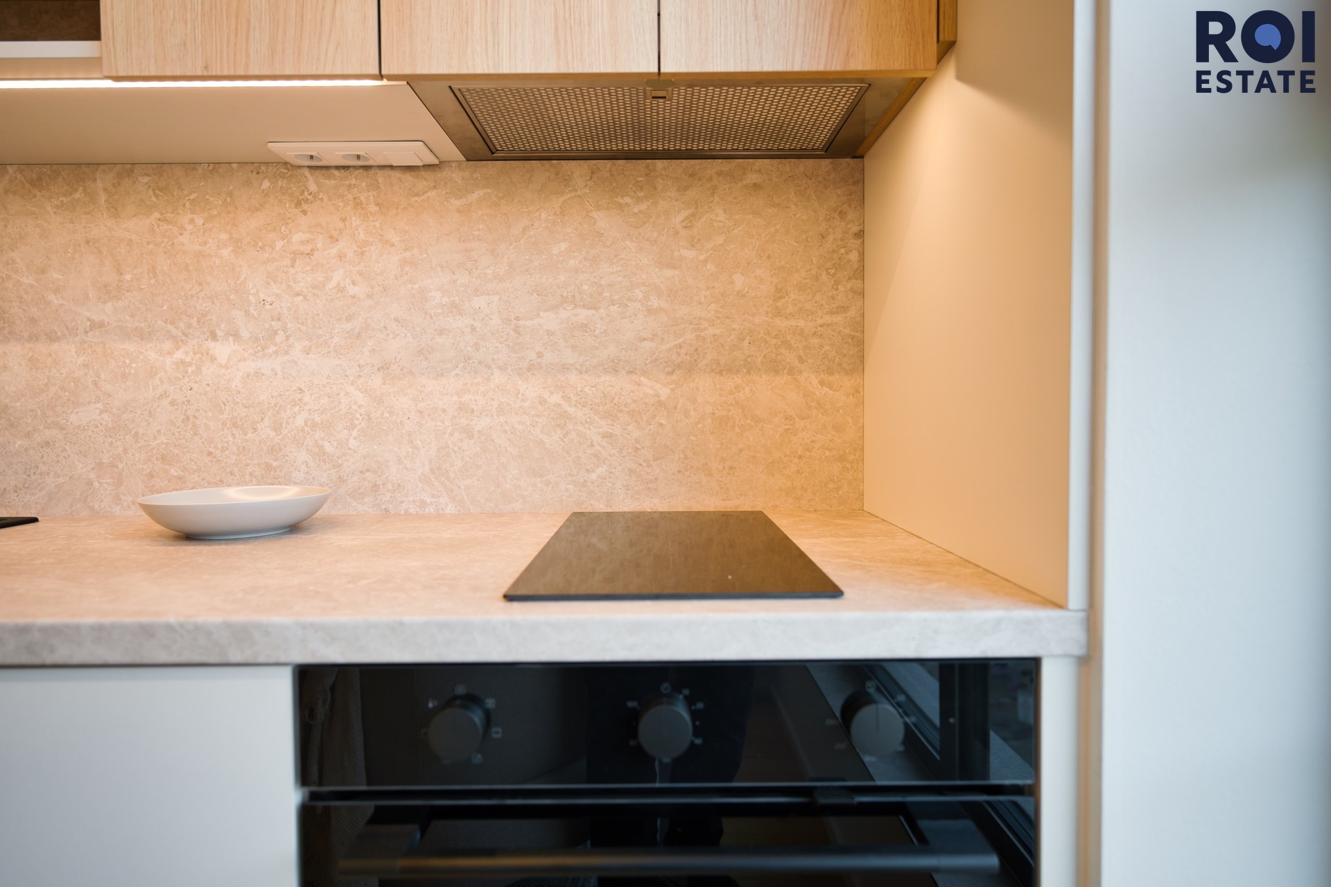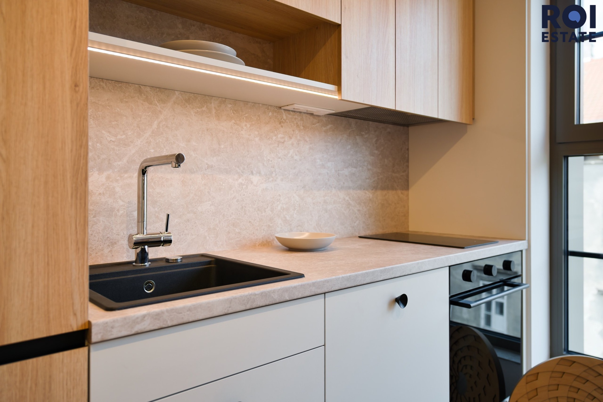 Interiér působí lehce, harmonicky a příjemně teple díky kombinaci přírodního dřeva, světle šedých tónů a jemného ambientního osvětlení. Kuchyňská linka je plně vybavená vestavnými spotřebiči, nechybí indukční varná deska, trouba, digestoř ani chladnička. Promyšlené úložné prostory přirozeně navazují na obytnou zónu s pracovním koutem, který působí elegantně i prakticky zároveň.