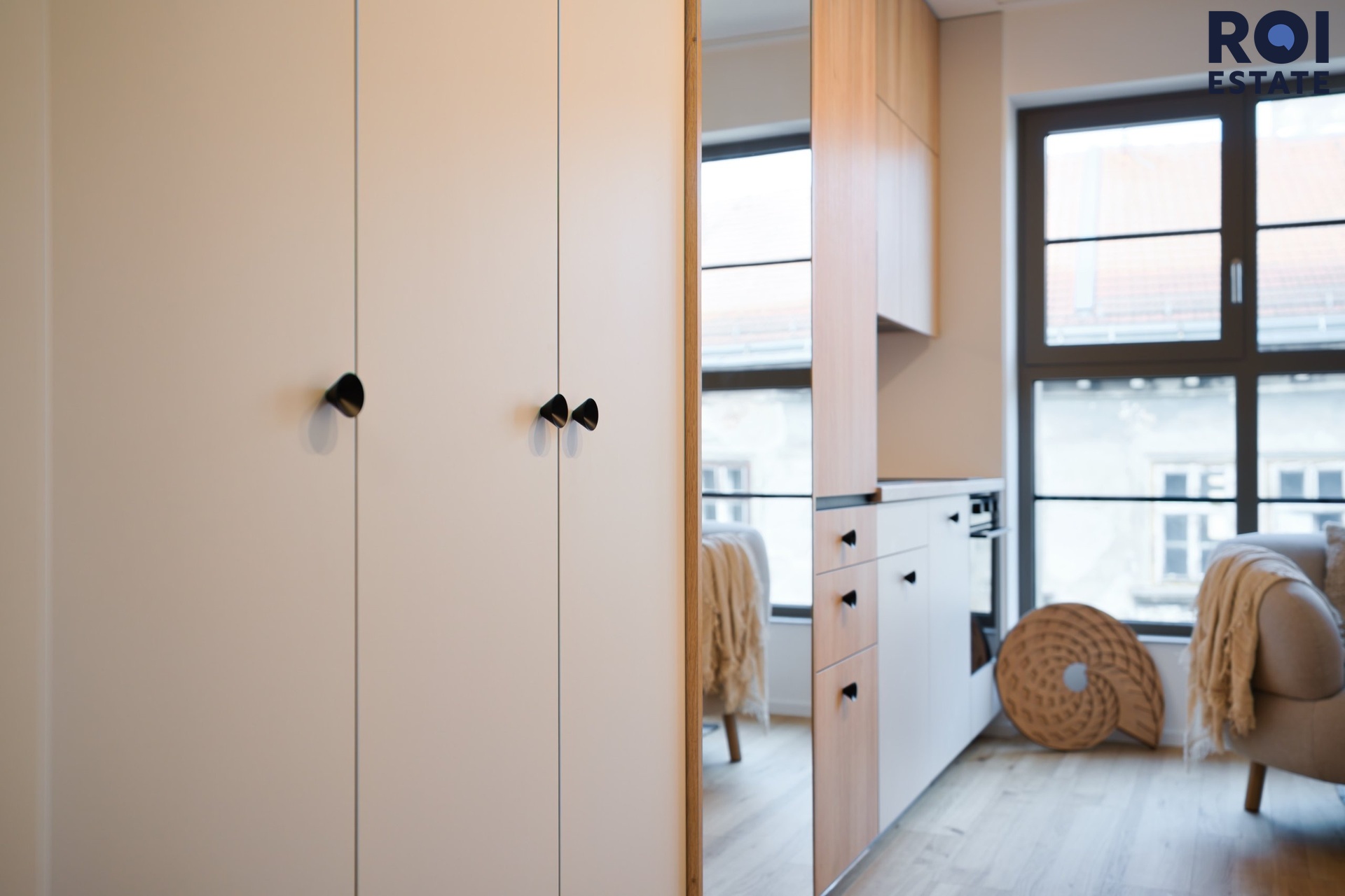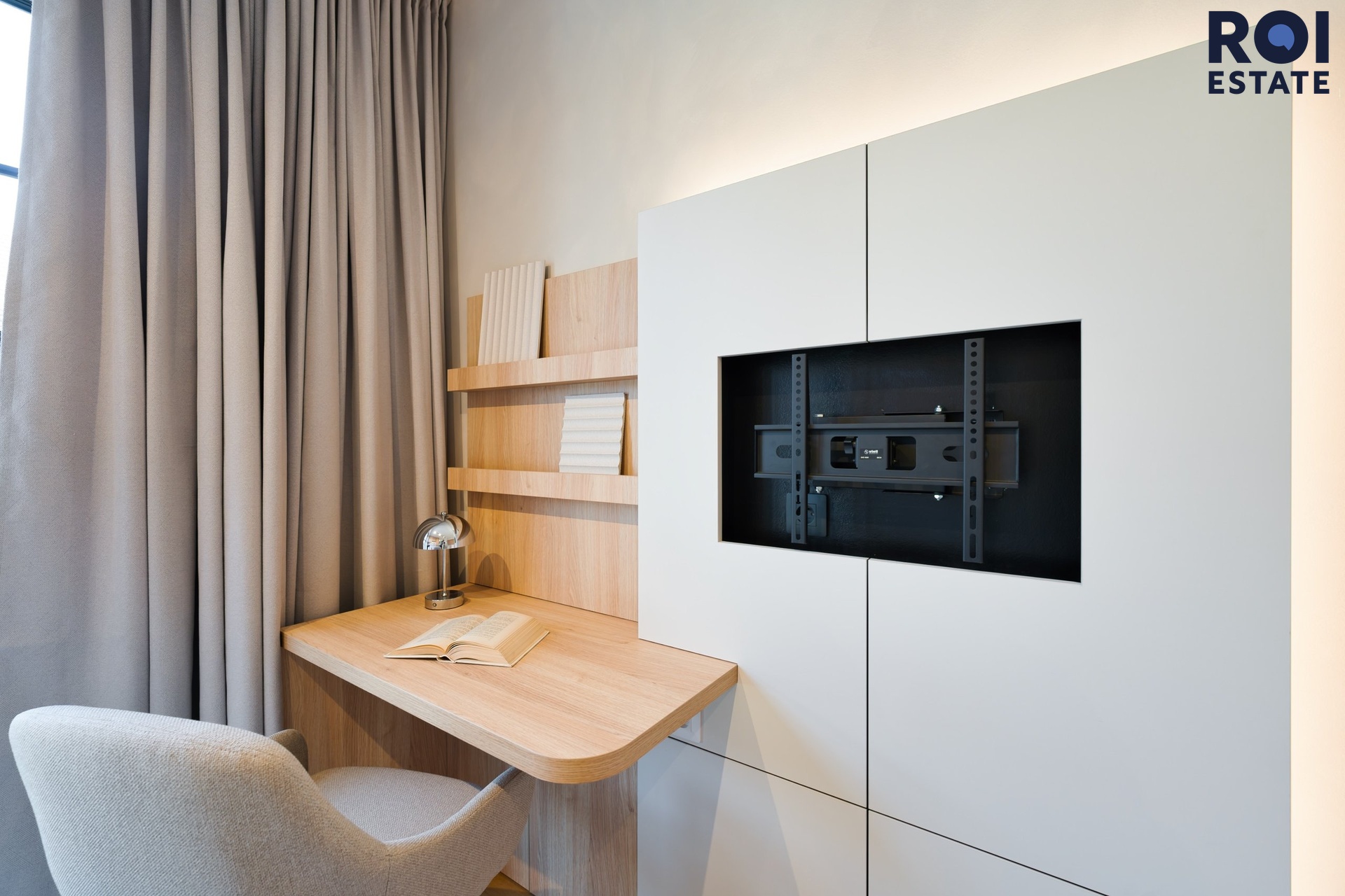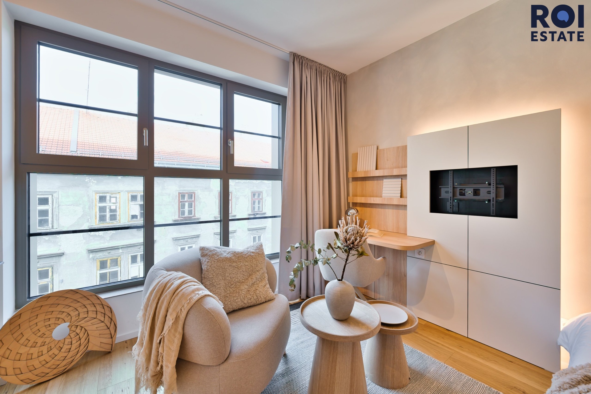 Interiér působí lehce, harmonicky a příjemně teple díky kombinaci přírodního dřeva, světle šedých tónů a jemného ambientního osvětlení. Kuchyňská linka je plně vybavená vestavnými spotřebiči, nechybí indukční varná deska, trouba, digestoř ani chladnička. Promyšlené úložné prostory přirozeně navazují na obytnou zónu s pracovním koutem, který působí elegantně i prakticky zároveň.