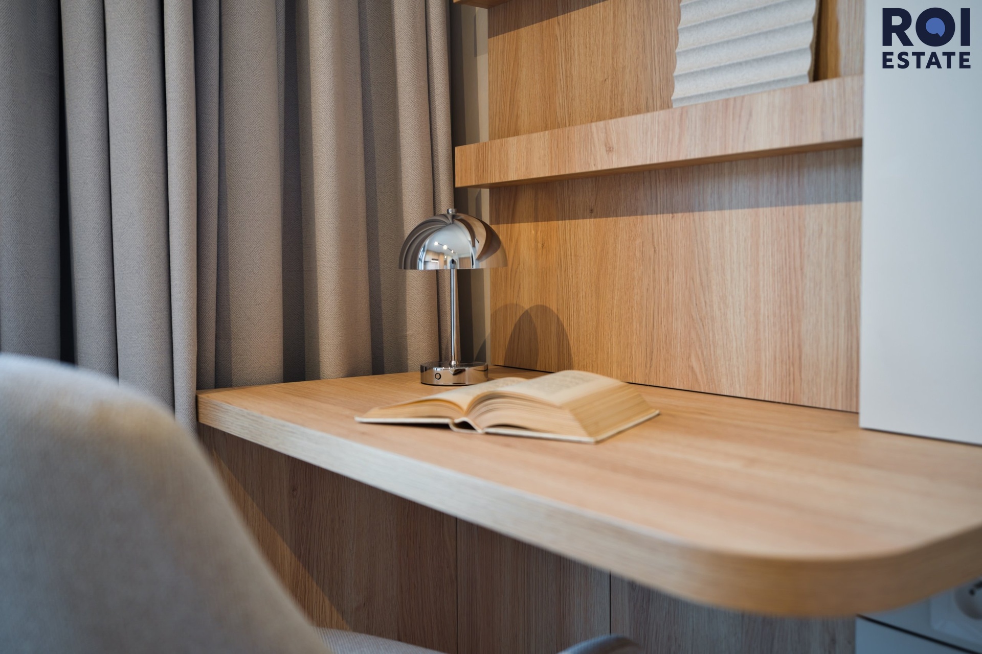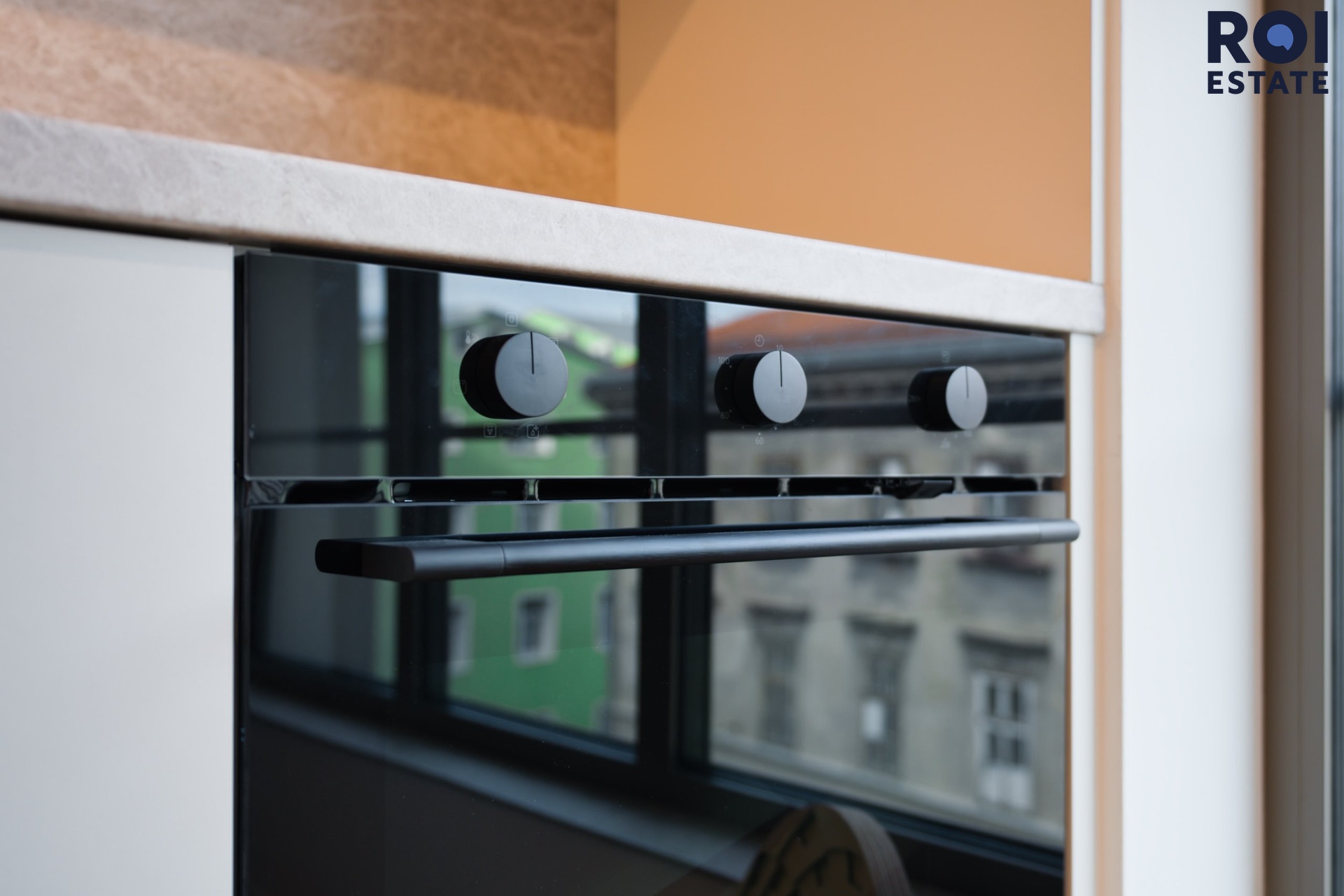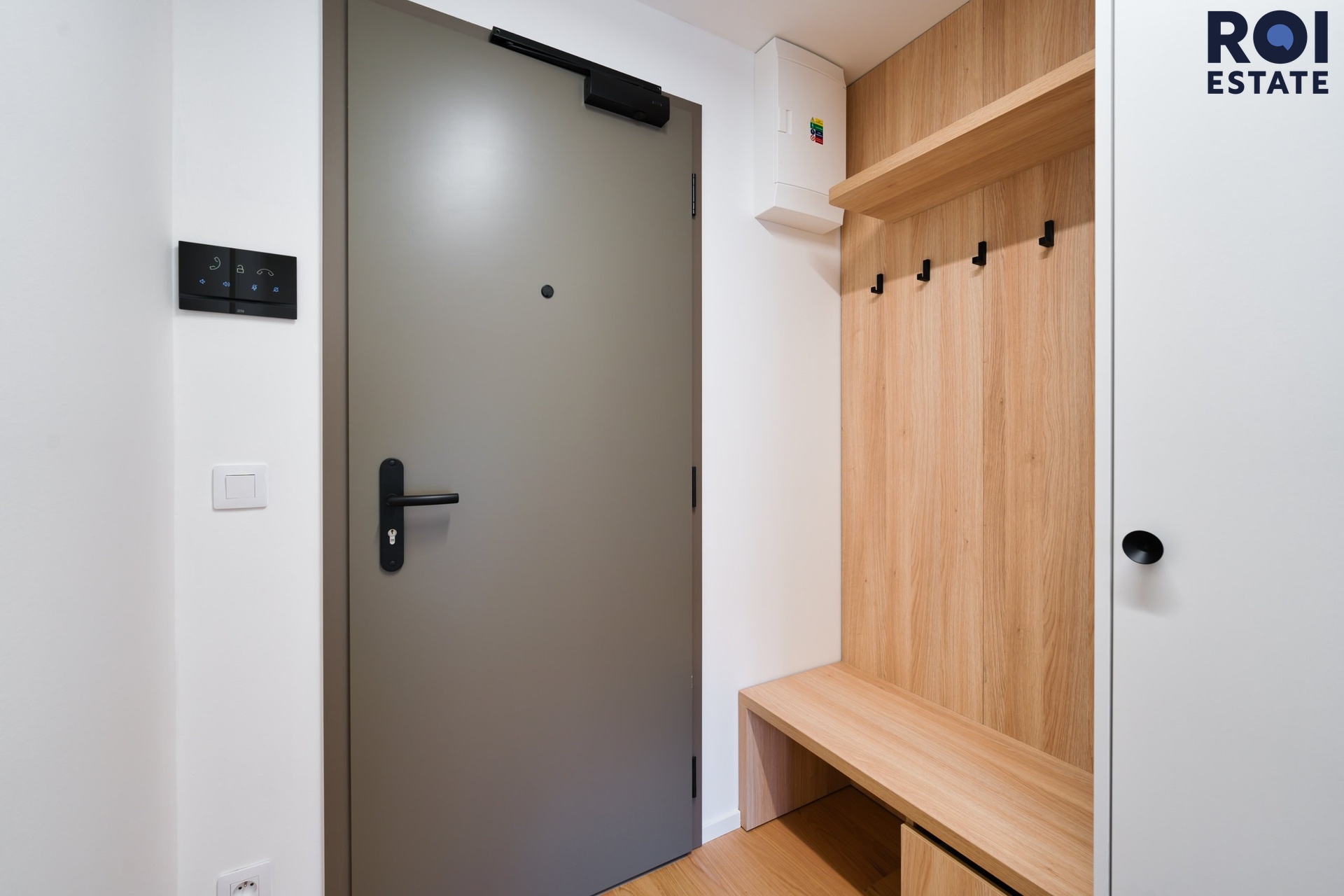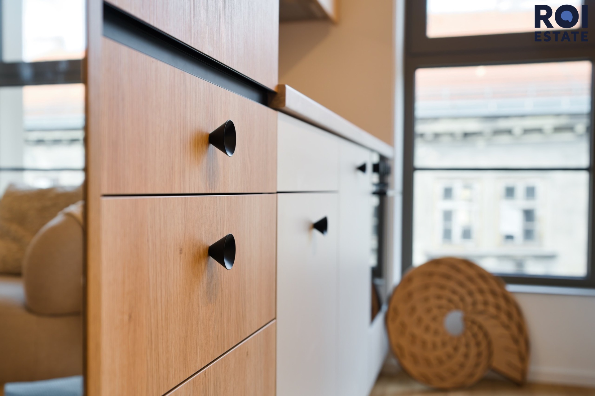 Interiér působí lehce, harmonicky a příjemně teple díky kombinaci přírodního dřeva, světle šedých tónů a jemného ambientního osvětlení. Kuchyňská linka je plně vybavená vestavnými spotřebiči, nechybí indukční varná deska, trouba, digestoř ani chladnička. Promyšlené úložné prostory přirozeně navazují na obytnou zónu s pracovním koutem, který působí elegantně i prakticky zároveň.