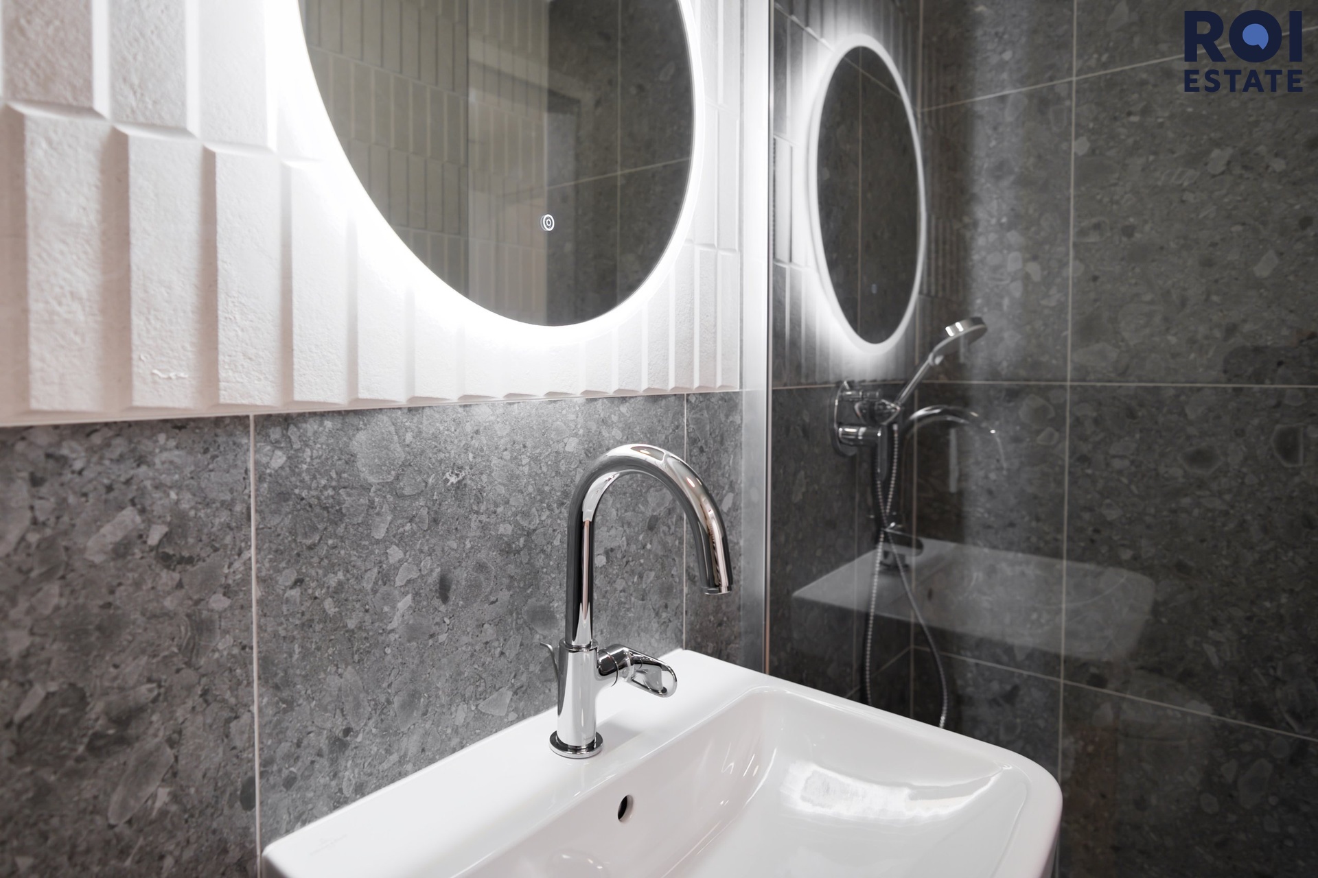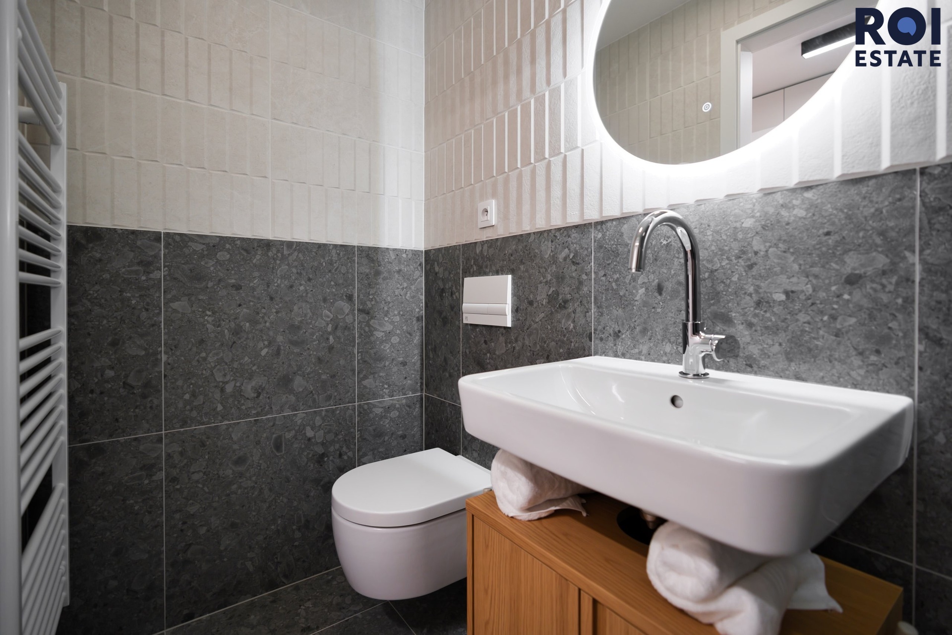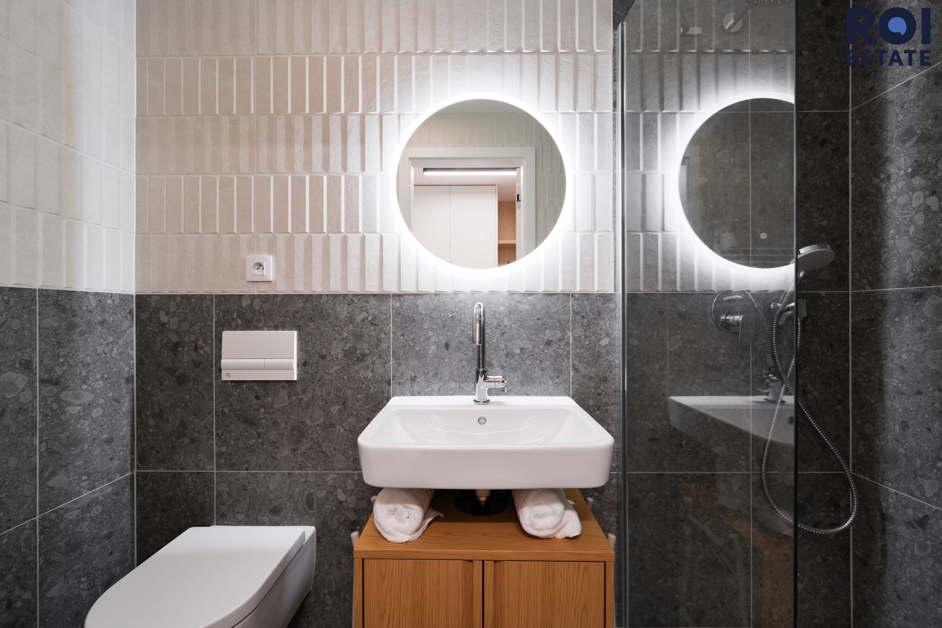Koupelna vás překvapí svou kvalitou – obklad v kamenném dekoru, sprchový kout se skleněnou zástěnou, designové kulaté zrcadlo s podsvícením a umývadlo na dřevěné skříňce tvoří příjemnou kombinaci moderního wellness stylu.