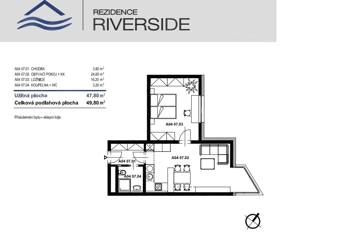 Dispozice: chodba 3,8 m², koupelna + WC 3,2 m², ložnice 16,2 m², obývací pokoj + kuchyňský kout 24,6 m² + sklepní kóje 2,6 m²
