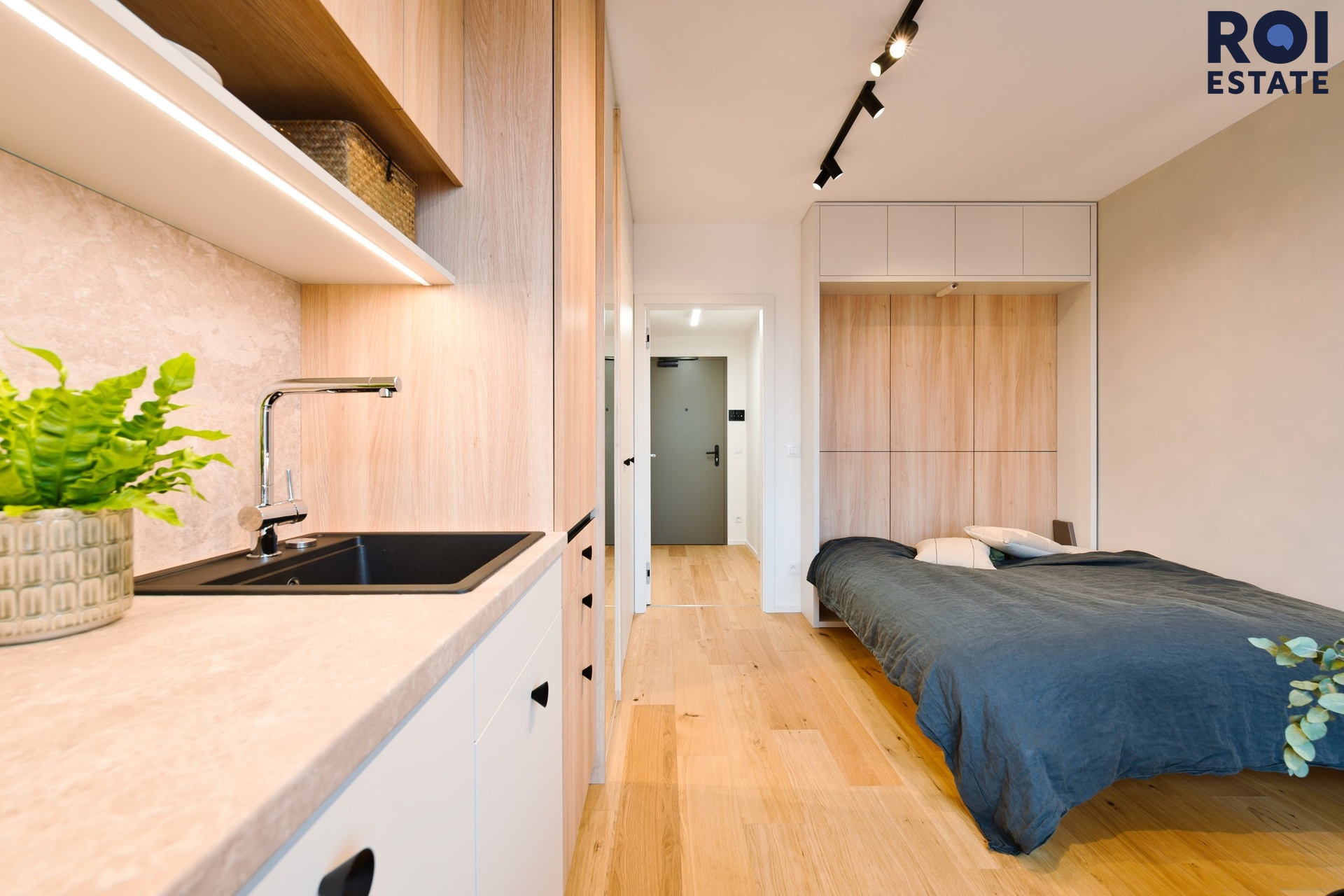 Při vstupu do pokoje vás zaujme velké okno, tedy dostatek světla a opravdu mnoho velmi dobře navržených úložných míst. Kuchyňská linka na míru s vestavěnými spotřebiči. Pracovní kout v stejném designu. A co říkáte na postel?