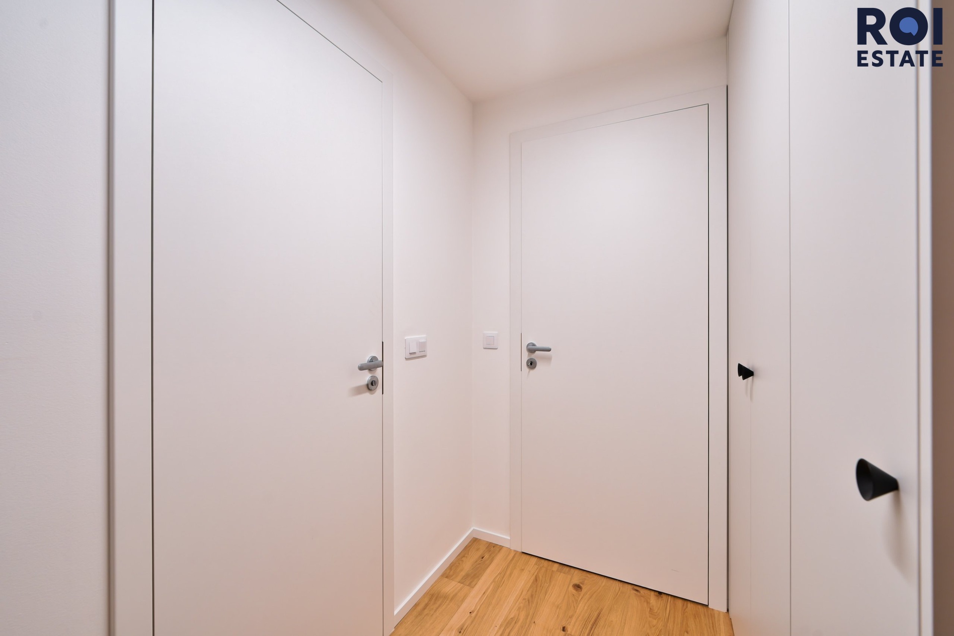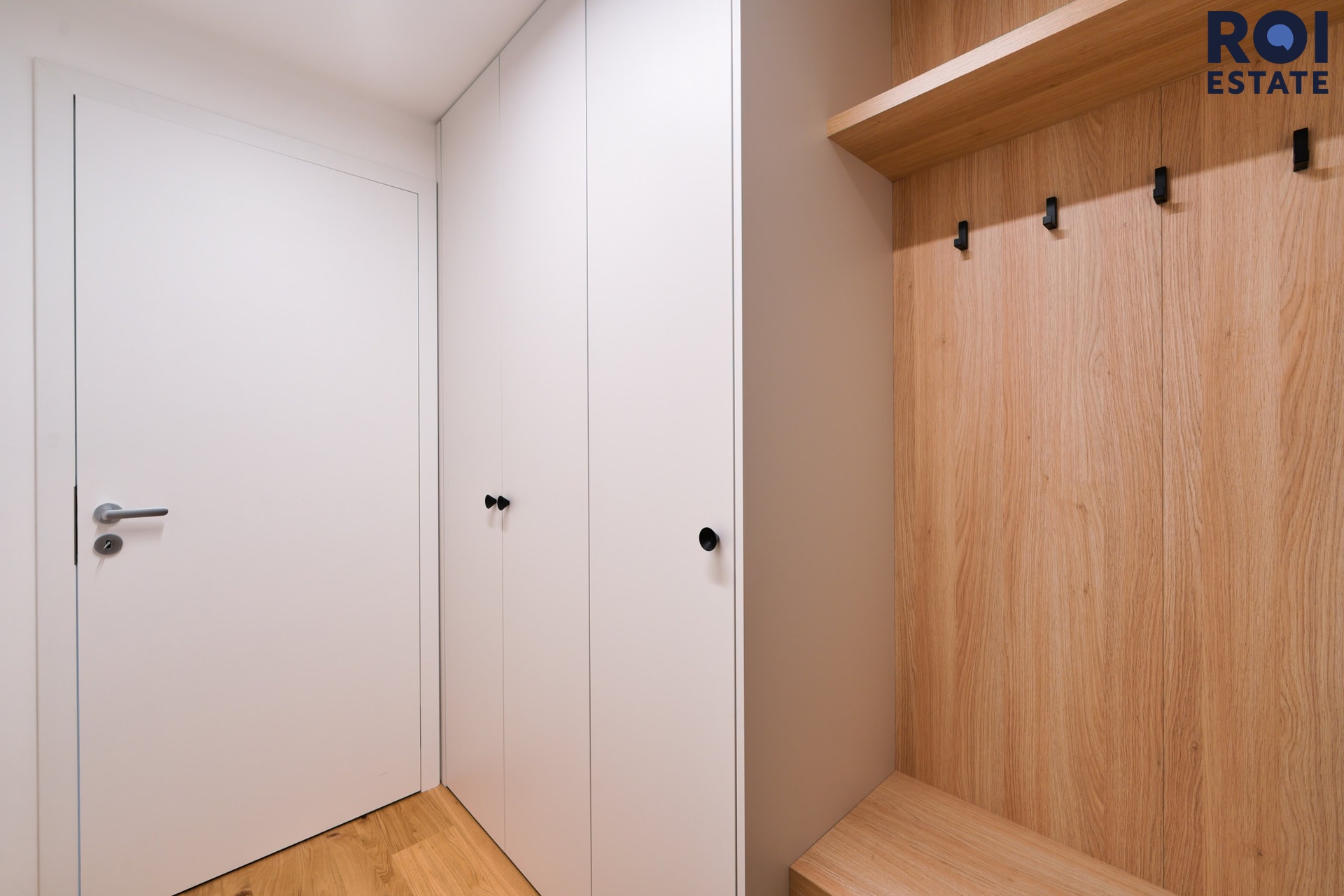 Interiér působí lehce, harmonicky a příjemně teple díky kombinaci přírodního dřeva, světle šedých tónů a jemného ambientního osvětlení. Kuchyňská linka je plně vybavená vestavnými spotřebiči, nechybí indukční varná deska, trouba, digestoř ani chladnička. Promyšlené úložné prostory přirozeně navazují na obytnou zónu s pracovním koutem, který působí elegantně i prakticky zároveň.