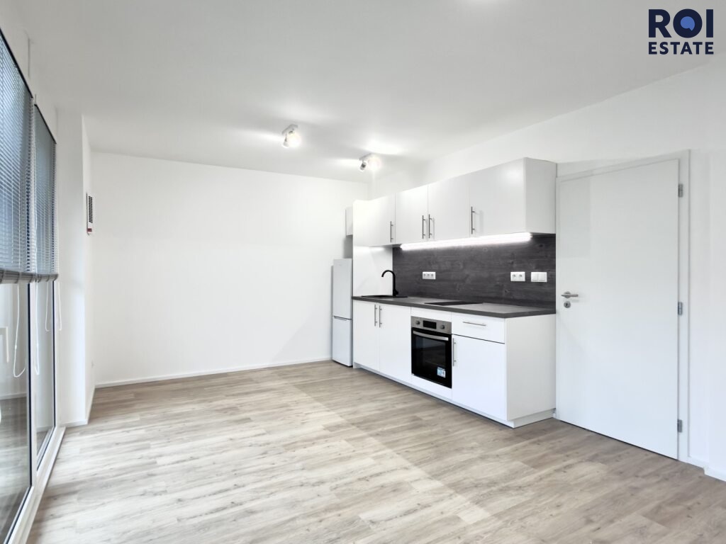 Byt nabízí vstupní předsíň s prostorem pro šatní řešení, moderní koupelnu se sprchovým koutem a hlavní obytný prostor s kuchyňskou linkou vybavenou elektrickou varnou deskou, troubou, lednicí a pračkou.