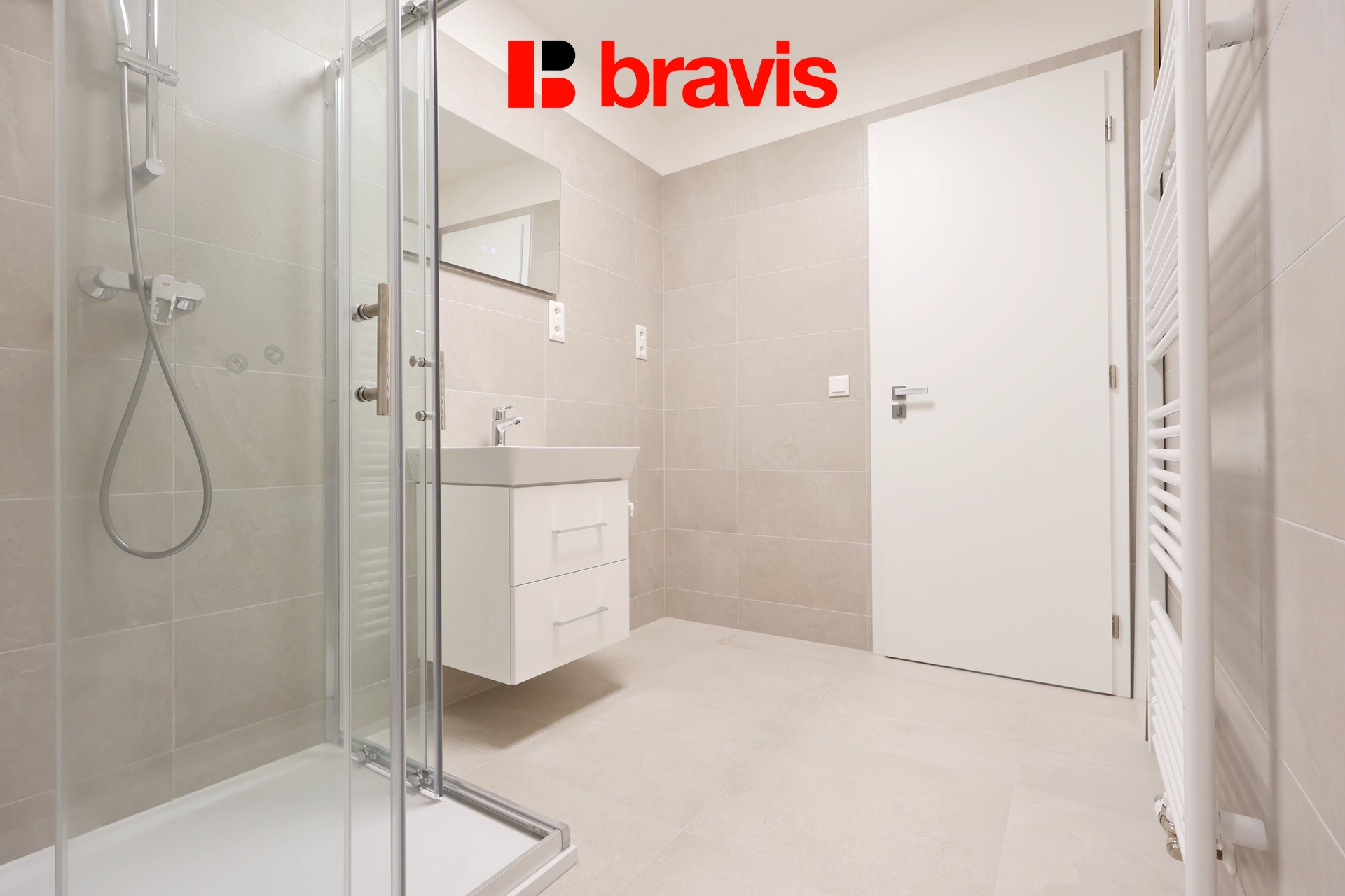 Koupelna disponuje sprchovým koutem, umyvadlem, toaletou, otopným žebříkem a přípojkou na pračku.