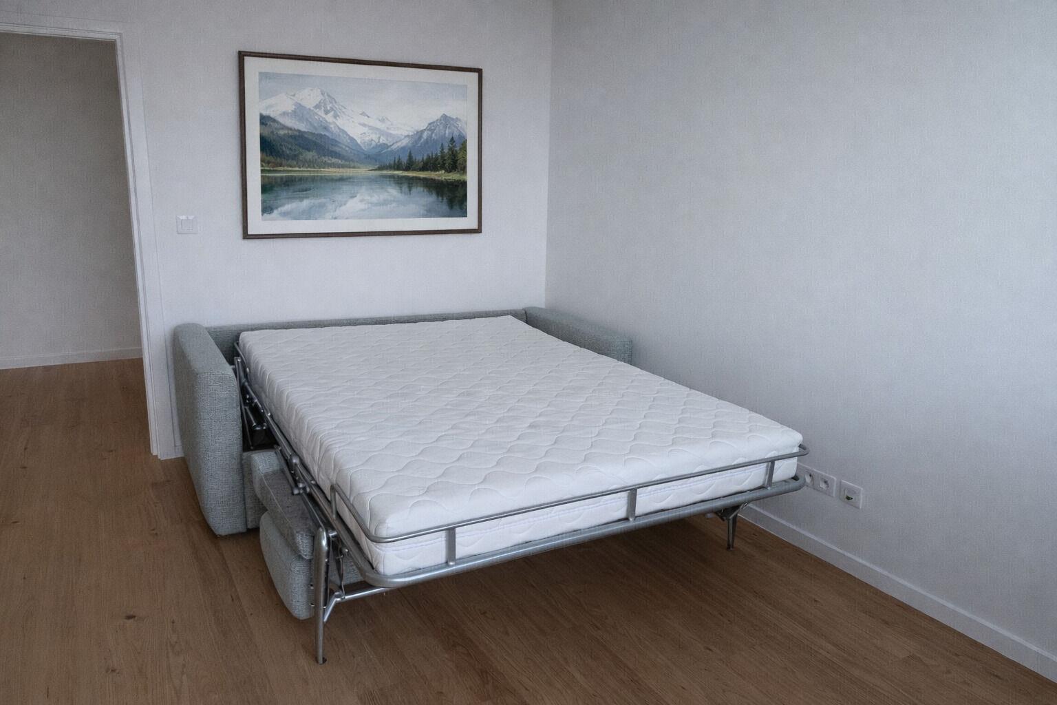 Rozkládací gauč s obrovskou madrací – sklopíte ho, odsunete na kolečkách a bum, máte ložnici na míru.