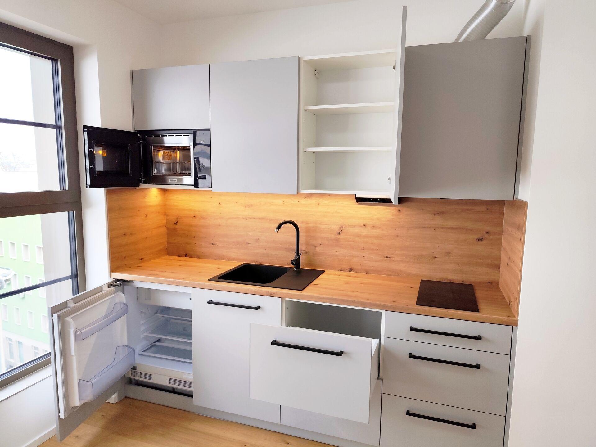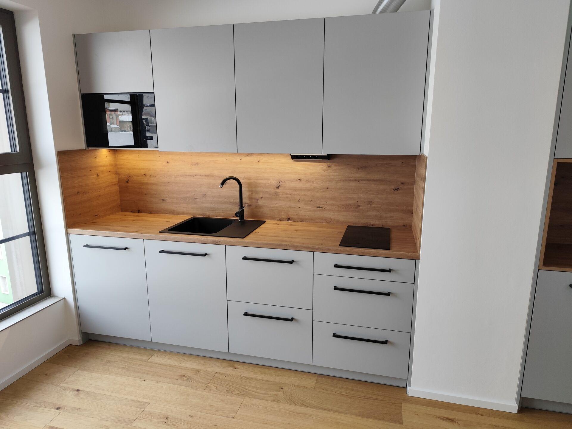 Pračka, kuchyňská linka s megaskříněmi, lednička, mikrovlnka s grilem, indukční vařič – vařte jako profík, bez stresu.