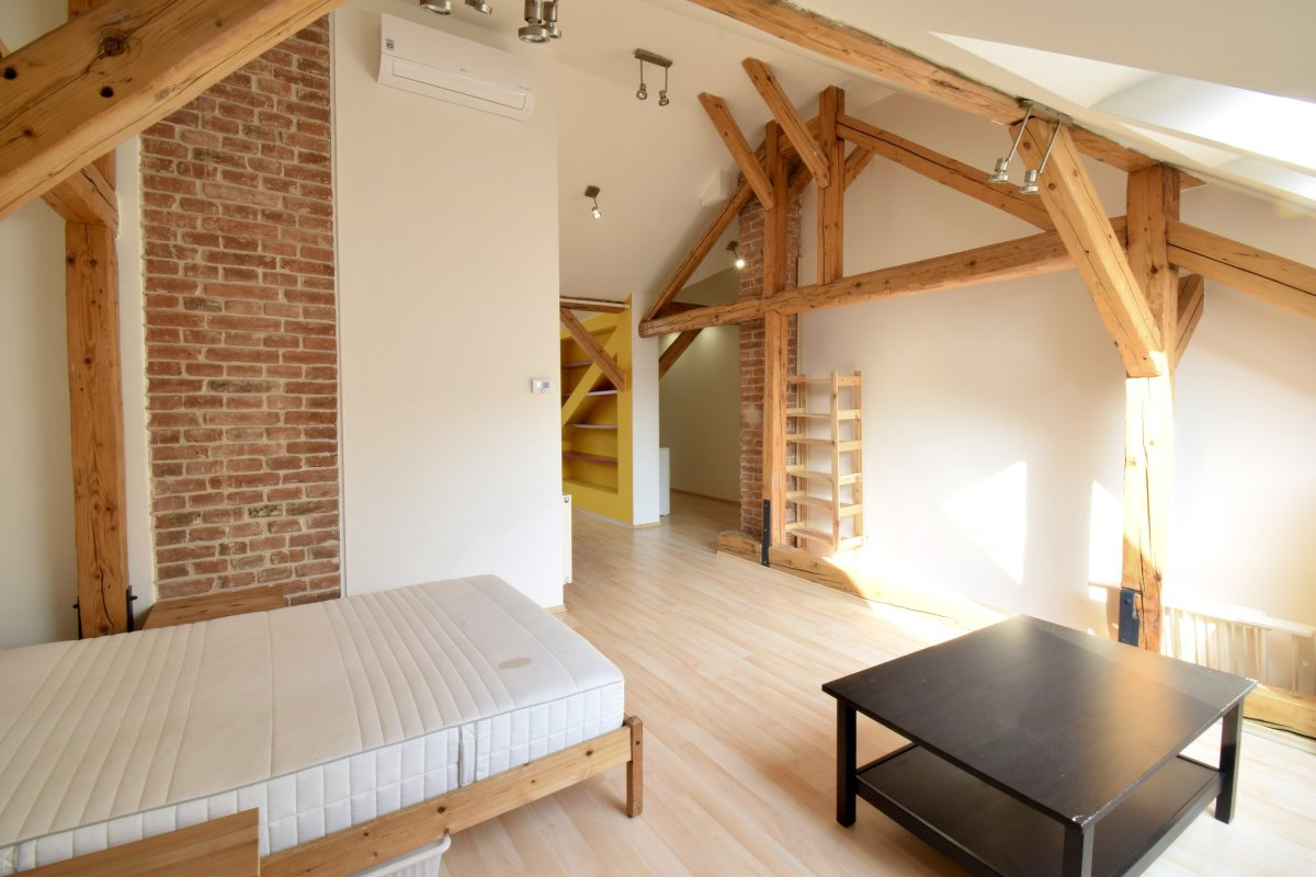 K dlouhodobému podnájmu nabízíme krásný prostorný byt o dispozici 1+kk ve skvělé lokalitě. Byt o celkové výměře 58 m2 se nachází v pátém patře historické cihlové budovy. Na patře jsou pouze dva byty.