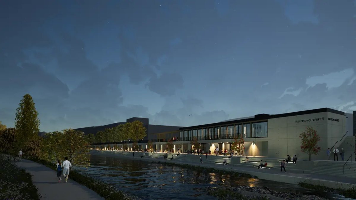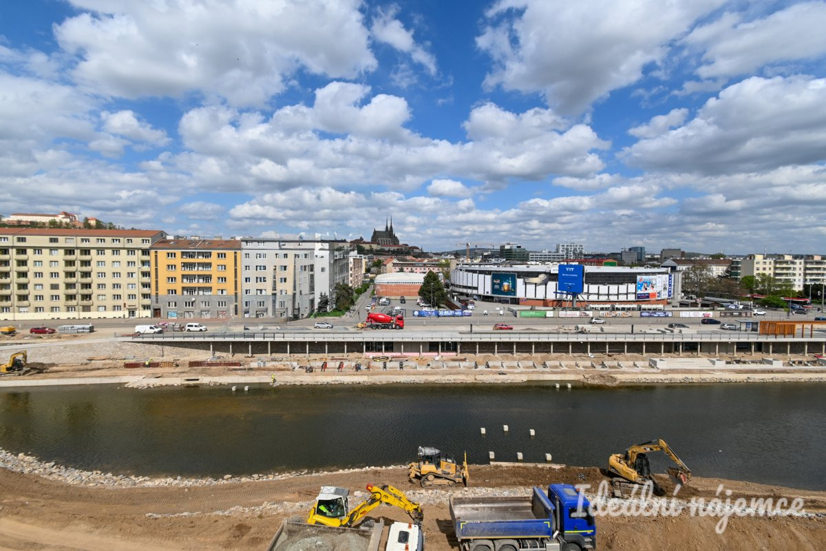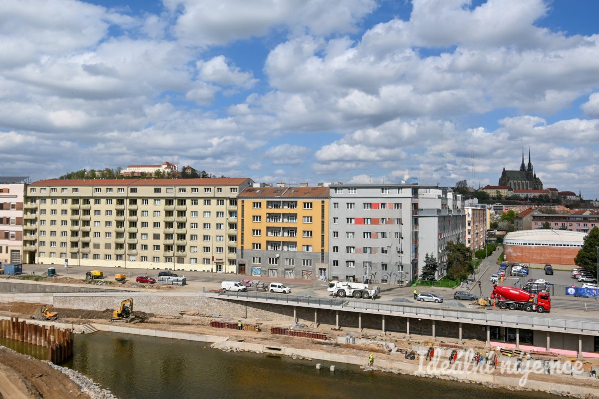 Přímo před domem se rozprostírá brněnská Náplavka, která nabízí příjemné místo pro odpočinek i procházky podél řeky.