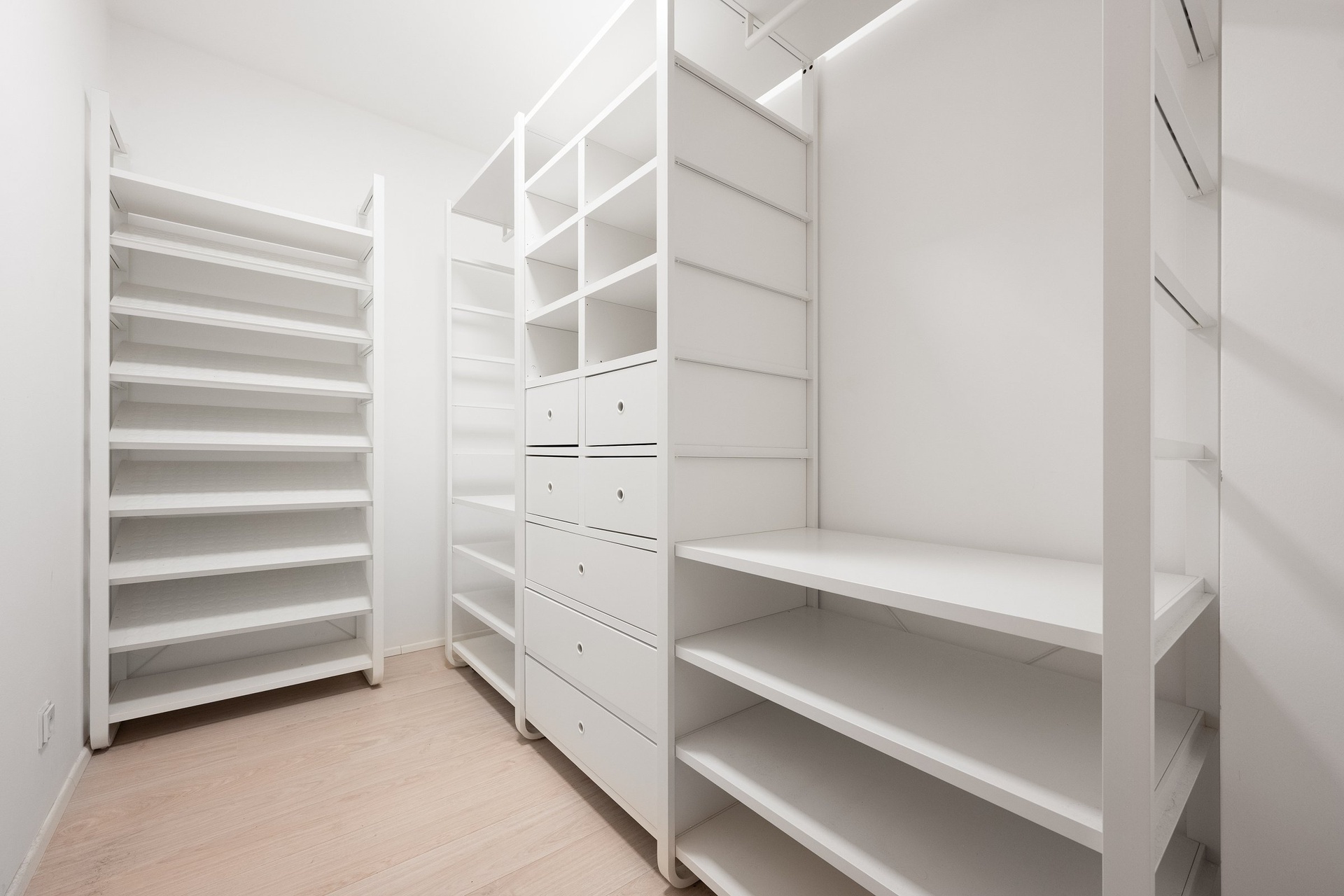 Z předsíně je dále přístupná koupelna spojená s WC, vybavená walk-in sprchovým koutem, umyvadlem, zrcadlem a pračkou. Ohřev teplé vody je zajištěn vlastním elektrickým bojlerem. Bezprostředně vedle koupelny se nachází samostatná komora s vestavěným úložným systémem na míru, vhodná pro oblečení a další domácí potřeby. Další dveře z předsíně vedou do samostatné ložnice, která je vybavena manželskou postelí, dvěma nočními stolky s lampičkami a doplněna křeslem se stojací lampou.