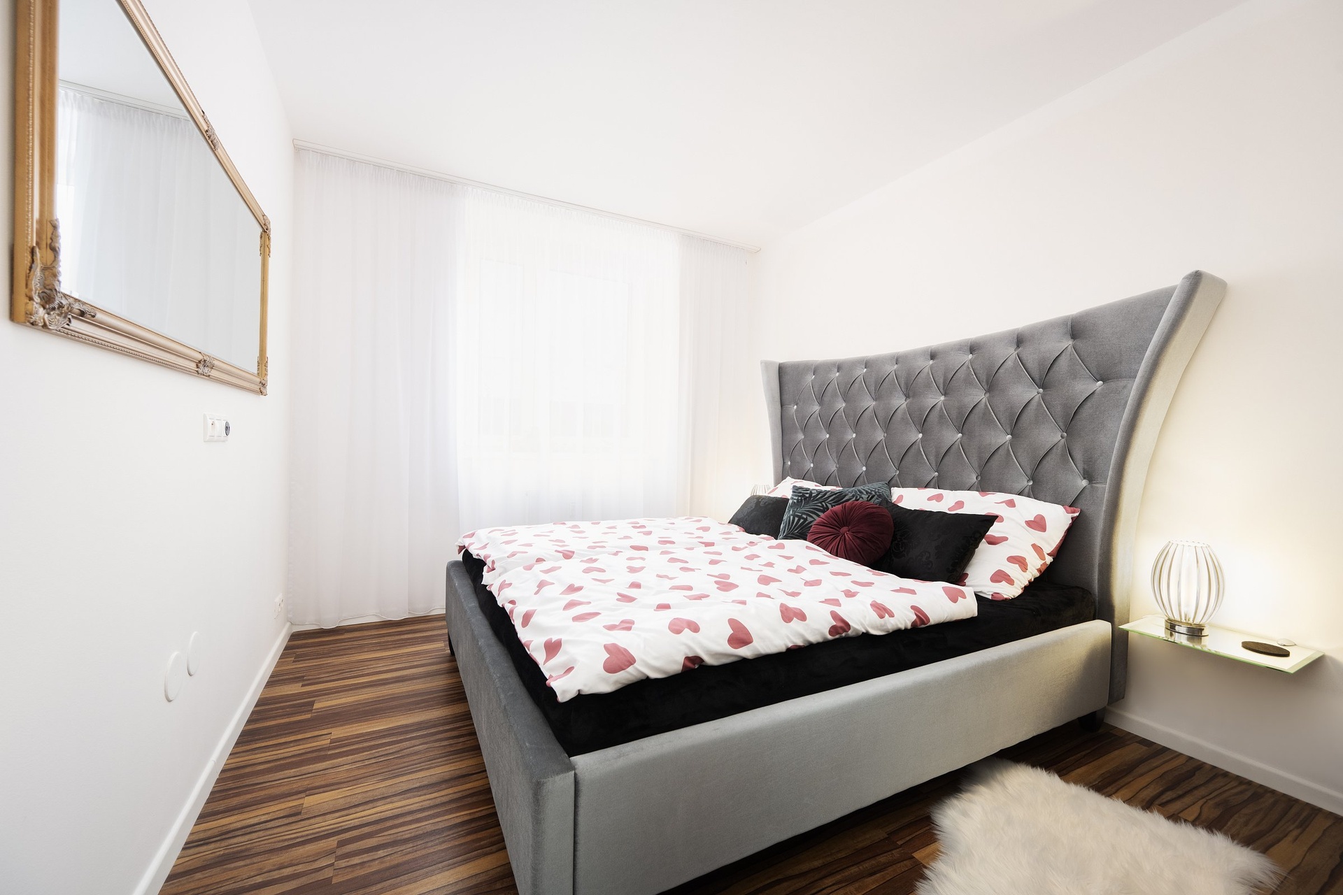 V ložnici je manželská postel. Okno je orientováno do klidného vnitrobloku.